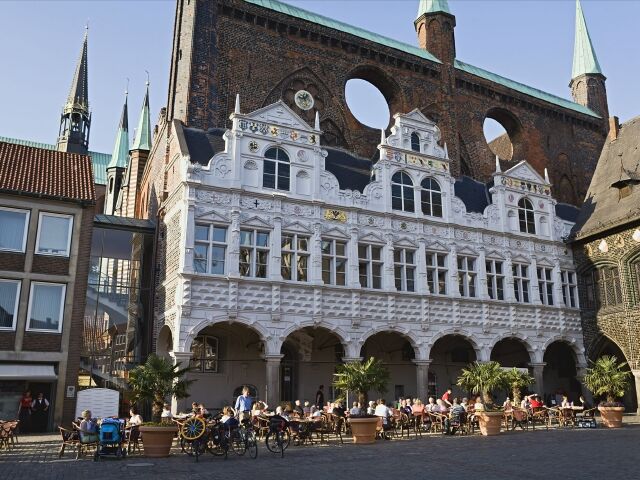 ●【吕贝克市政厅】(游览不少于15分钟),建成于13至15世纪。市政厅被形容为“石头建成的神话”,具有独特的建筑风格,它一半是哥特式的,另一半是丽娜莎挪式。
