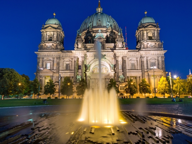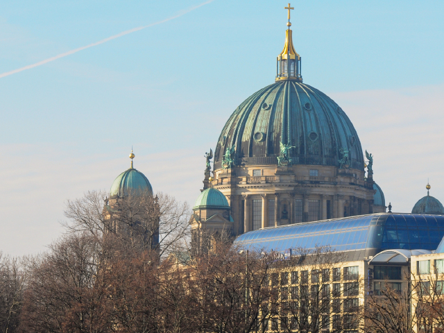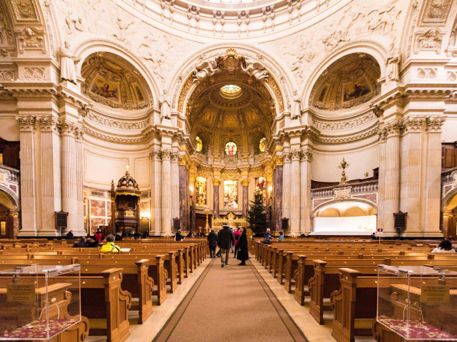 ●【柏林大教堂】外观(游览不少于15分钟),是基督教路德宗教堂,曾是德意志帝国霍亨索伦王朝的宫廷教堂。建筑风格为巴洛克式和文艺复兴式,内饰极为华丽,白金色调为主,但只有少数房间对外开放。地下为王室陵墓,其中较珍贵的是大选帝侯及夫人Dorothea,弗里德里希国王一世及王后索菲·夏洛滕的棺材价值连城。
