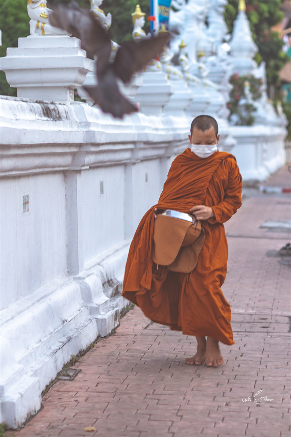 出师的那天,我换回了平常的衣服,拿起相机想记录些这座对我来说有着特殊意义的寺庙影像。巧遇一位穿着橙色僧袍的僧人拿着黄姜花塔前去赕佛,见到我时微微一笑。我忽然看懂了这抹宁静 平和 的笑容背后是何种心态,用修行者对世间万物都需珍重的情感回报了同一抹笑容。