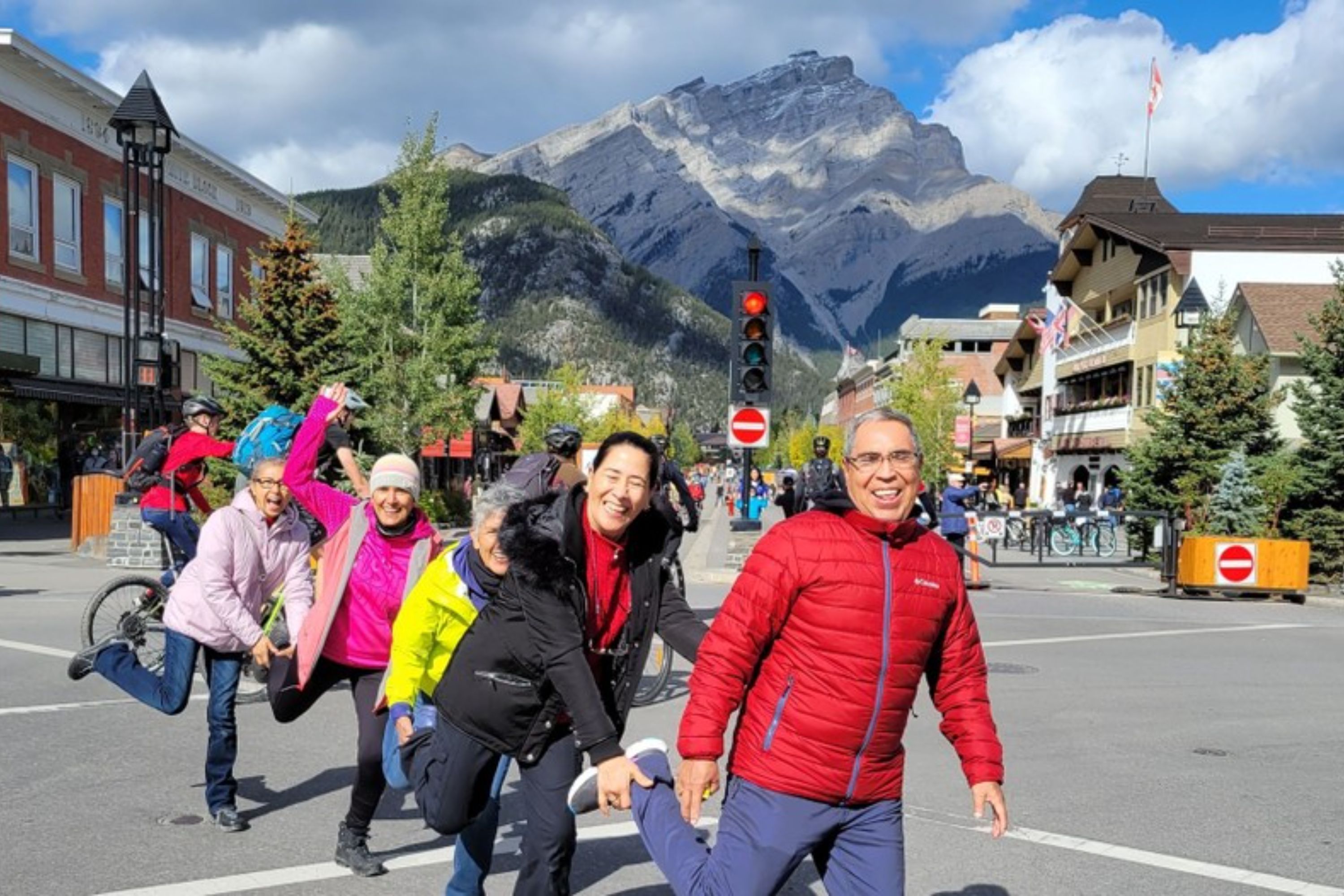 在班夫国家公园聚集拍照,以令人惊叹的山脉和清晰的蓝天为背景