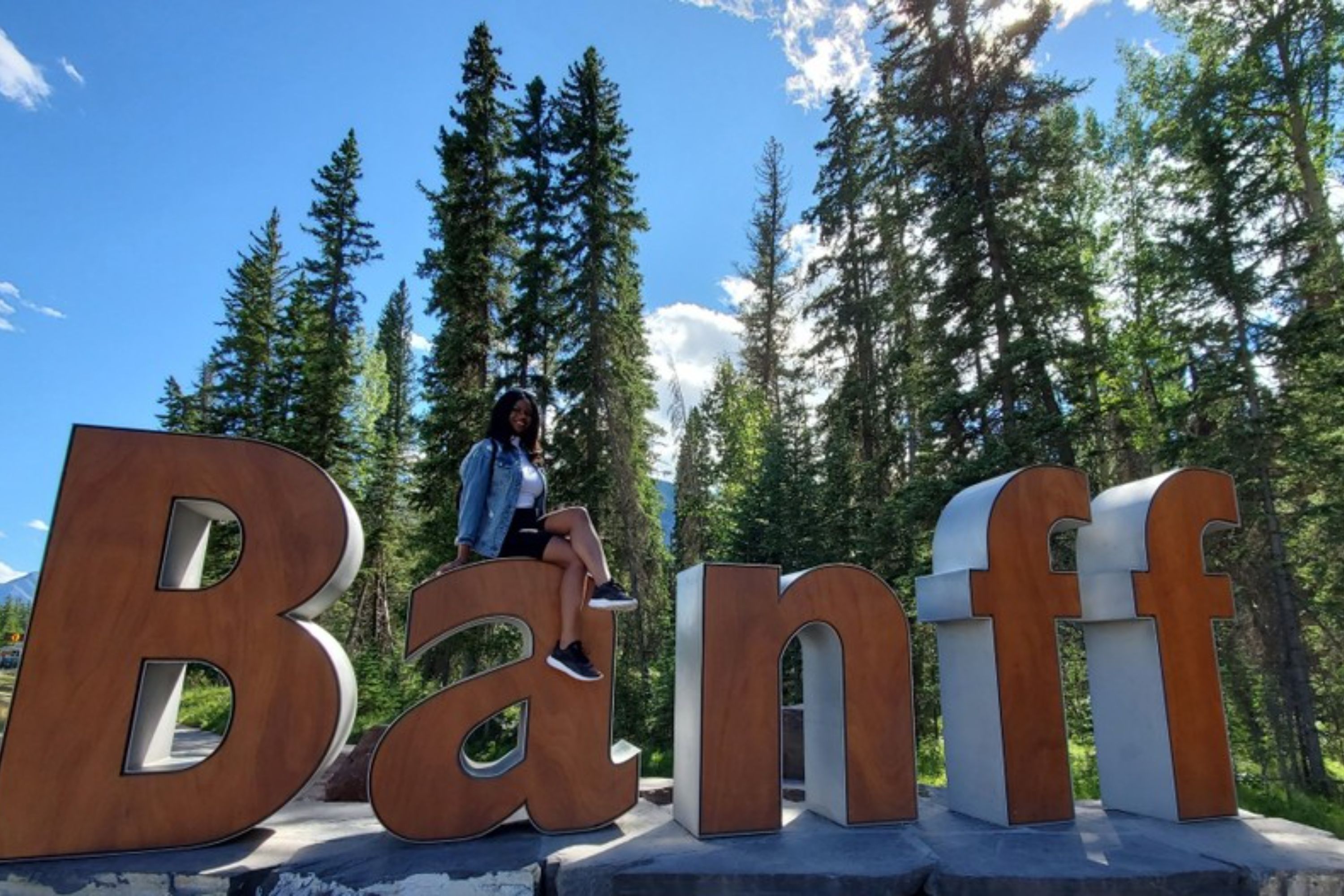在班夫镇标志处留下美好回忆,周围环绕着风景如画的山景