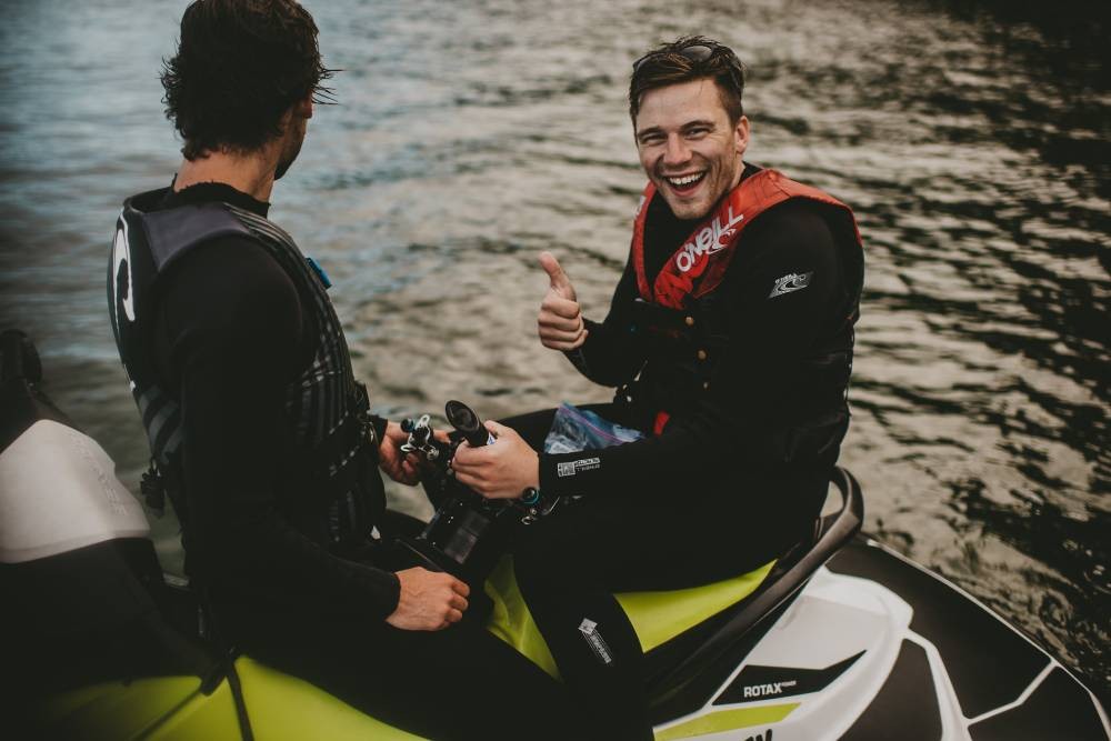 一群朋友一起驾驶强大的 Seadoo 水上摩托艇巡航,开怀大笑