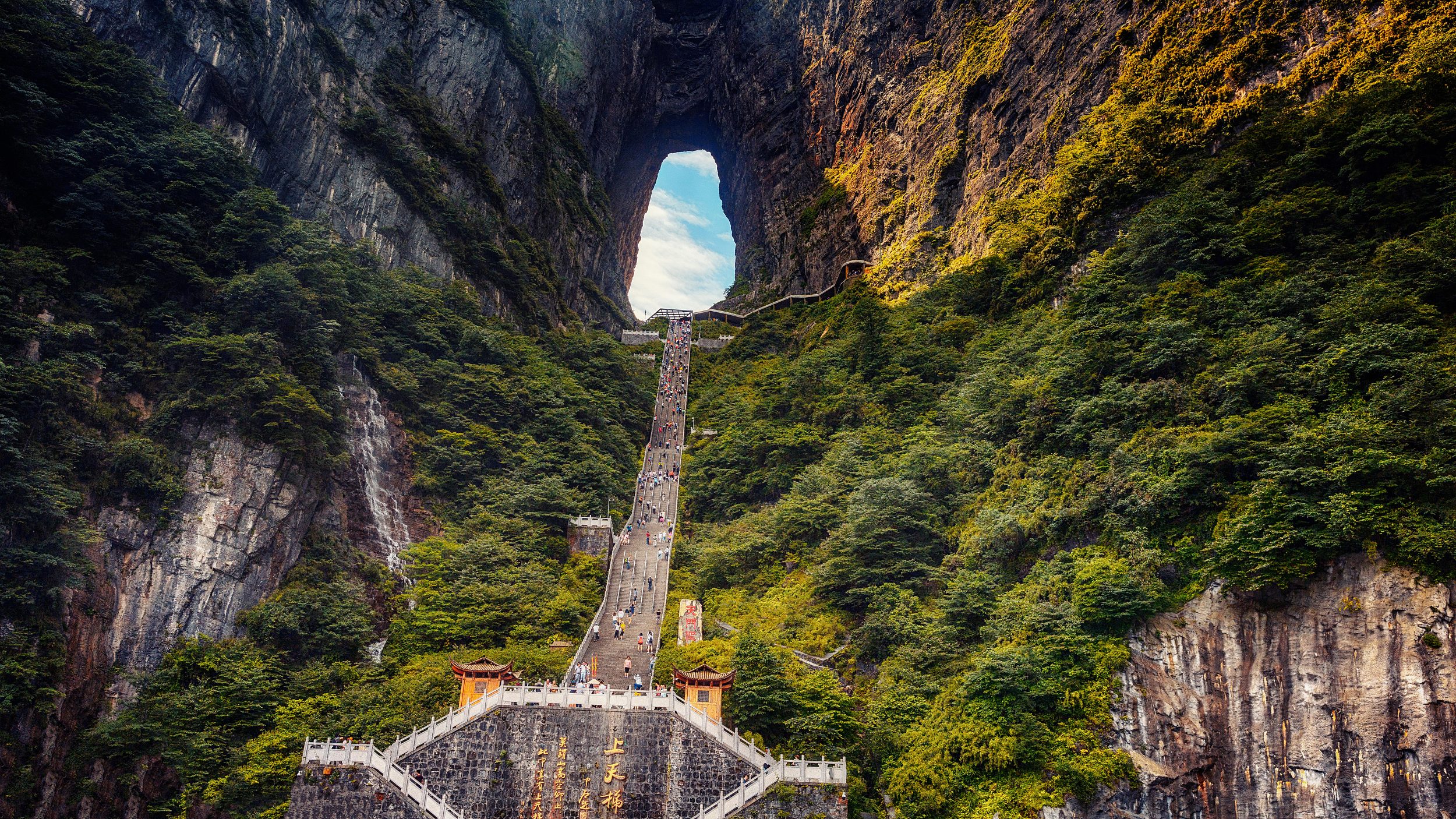 亲临气势磅礴的天门洞,这个高131.5米、宽50余米的穿山溶洞如天外飞来,神秘壮观。挑战惊险刺激的玻璃栈道,脚下是万丈深渊,眼前是壮丽山景,体验"凌空漫步"的无与伦比感受。