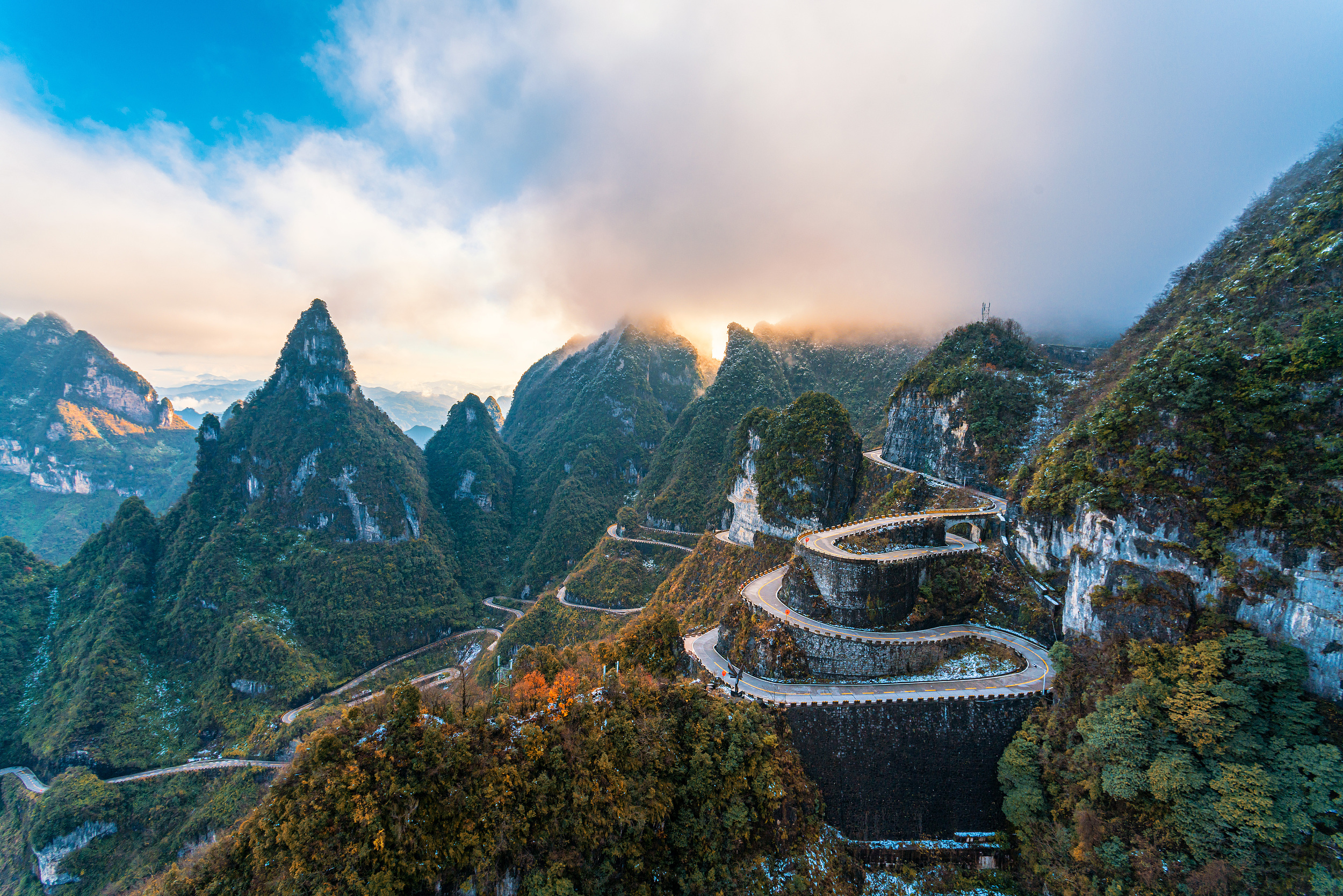 踏上通往云端的旅程!我们精心打造的张家界天门山一日游带您领略"武陵之魂"的壮丽风光。乘坐天门山索道,穿云破雾,直达海拔1300米的山顶,俯瞰99道弯盘山公路。