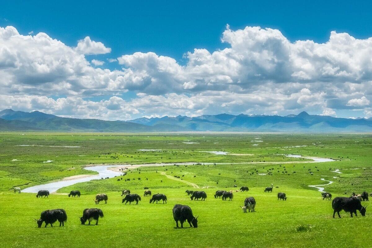 牦牛坪风光正好,草浪随风翻涌,牦牛自在觅食,雪山绵延相伴,开启一场治愈之行