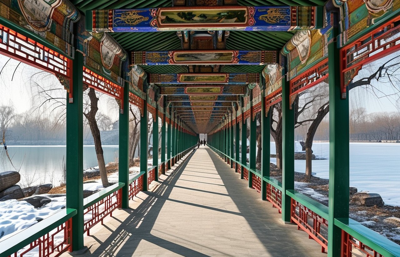 颐和园漫步长彩绘走廊,14000幅画作中寻找《三国演义》赤壁火攻(第237根梁)、孙悟空三打白骨精(第681根梁)。每步跨越0.75米,即穿越中国艺术史50年