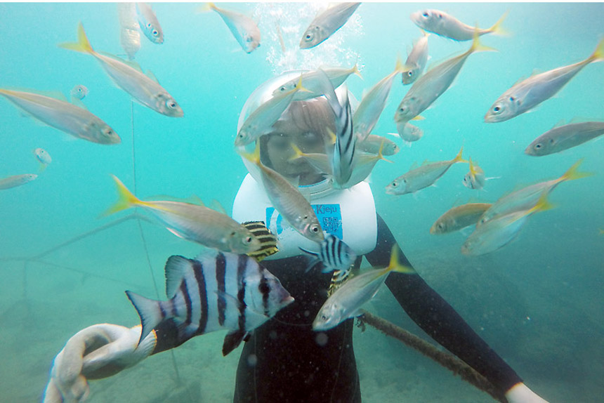 **水下体验:** 海底漫步让参与者有机会在水下观察和探索各种海洋生物、珊瑚礁和海底地貌。它适合儿童和成人,因为您无需潜水装备即可舒适地潜入水下。