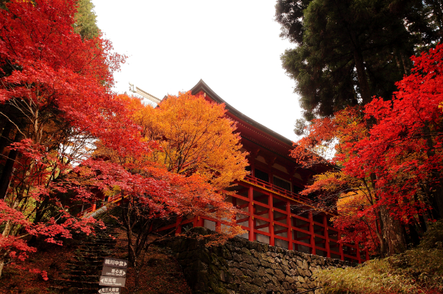 秋天,您可以看到寺庙的壮丽景色和色彩缤纷的秋叶