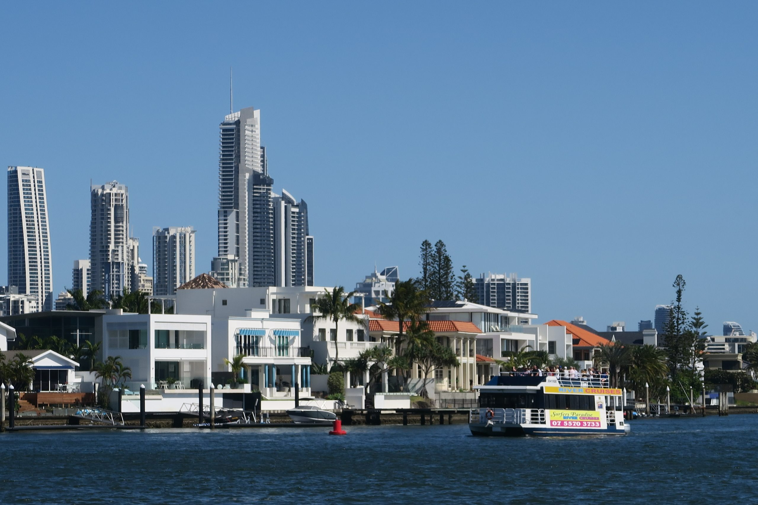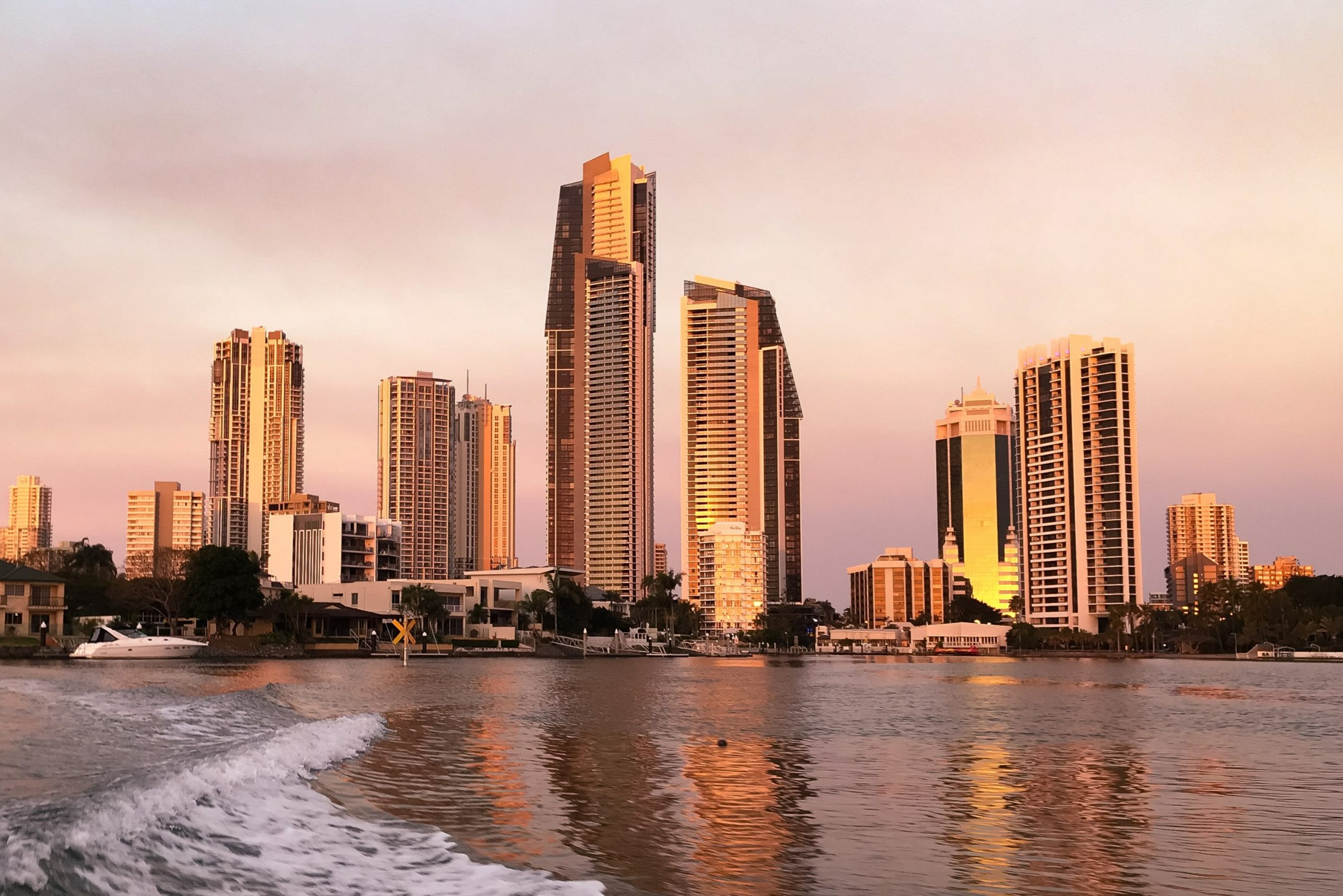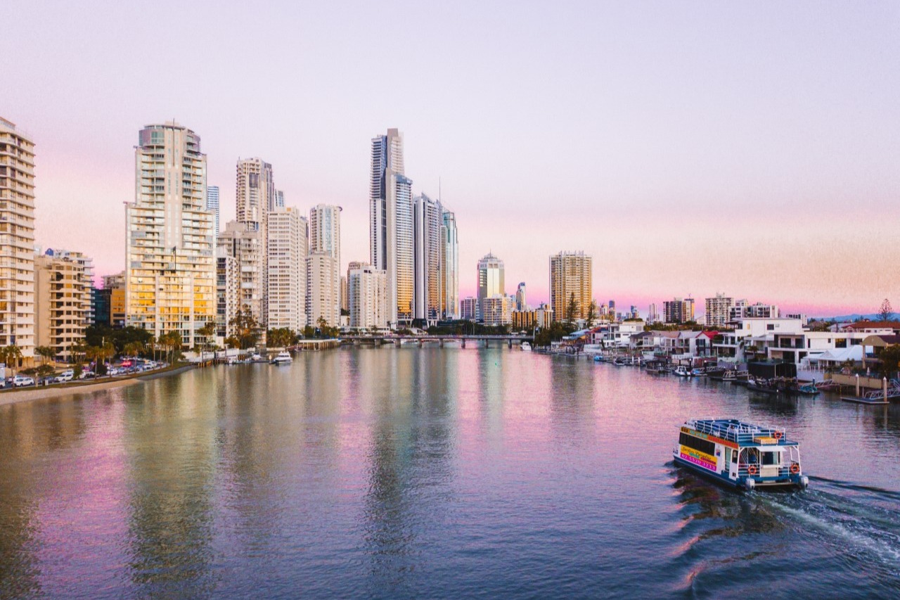 在令人惊叹的黄金海岸日落游轮上放松身心,欣赏冲浪者天堂运河、海市蜃楼码头和布罗德沃特的美景