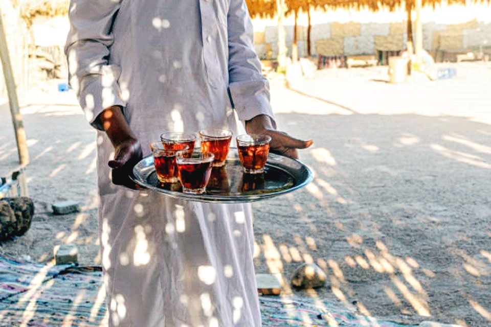 在沙姆沙伊赫北部体验骑骆驼和滑沙后,在贝都因帐篷中享用传统茶点,放松身心。