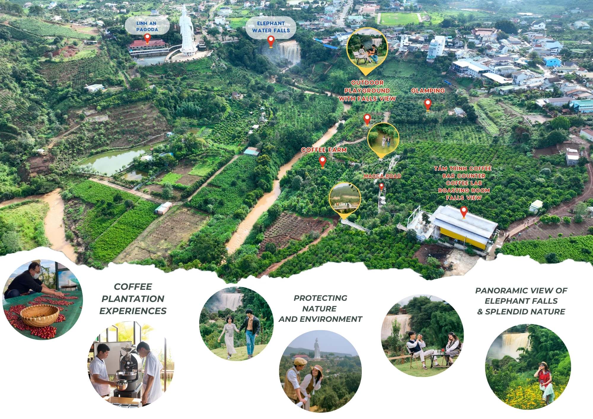 这个风景如画的旅游胜地坐落在郁郁葱葱的山顶上,周围环绕着芳香的松树、咖啡树、澳洲坚果树和鳄梨树