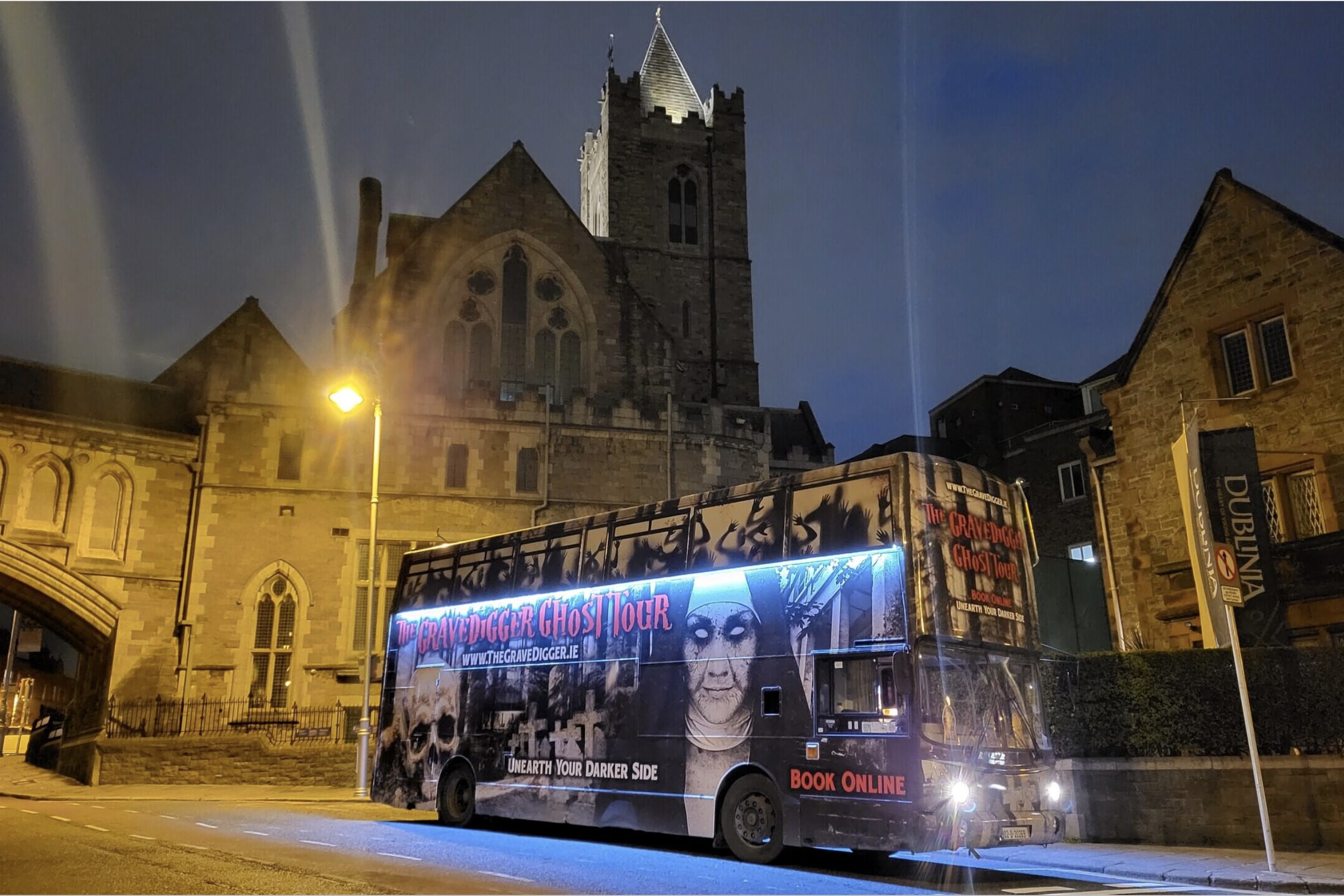 幽灵导游将带您穿越都柏林最黑暗的历史,巴士增添了一层额外的幽灵氛围