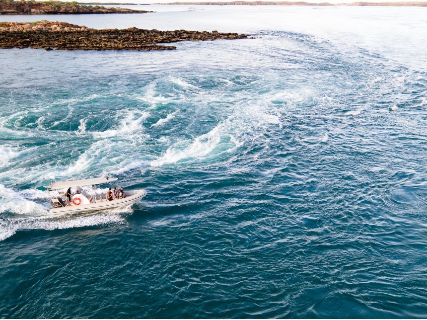 由于该地区的地理位置,金伯利海岸这一段的潮汐特别大。当太阳和月亮在大潮上对齐时,海水被拉向西澳大利亚和印度尼西亚的西北部,在到达浅大陆架时加速,在穿过澳大利亚和印度尼西亚之间时形成瓶颈,形成了我们在旅途中看到的令人兴奋的漩涡和驻波。2 小时的巨潮之旅从 Cygnet Bay Pearl Farm 的陆地基地出发,乘坐我们的两栖 Sealegs 船。