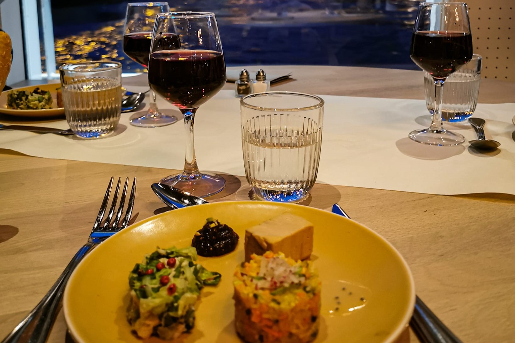 当您用餐时,您可以欣赏巴黎地标建筑的壮丽景色,如埃菲尔铁塔、巴黎圣母院和卢浮宫,所有这些都在优雅的灯光下。塞纳河温柔的河水增添了氛围,创造出真正神奇的体验。