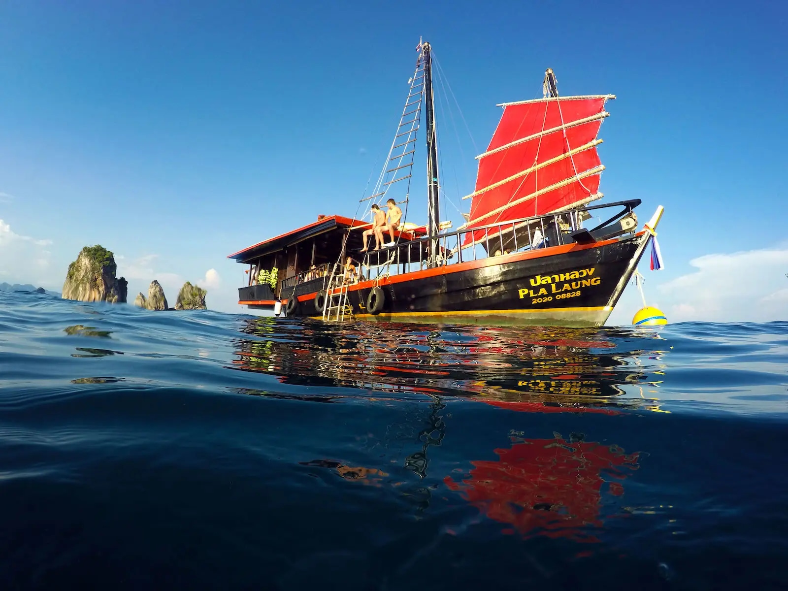 我们前往莱利前面的岛屿(Poda、Chicken、Si 和 Ta Ming),在那里浮潜和游泳。我们还有一艘 2 人皮划艇和 4 个站立式桨板供客人使用。你喜欢做多少就做多少。我们的柚木甲板非常适合放松身心并欣赏壮丽的景色。我们结束了一天的航行,返回莱利半岛,同时欣赏安达曼的日落。最后,我们可以在 Pranang 海滩旁边的水域游泳,为那些想要体验天黑后在生物发光中游泳的人提供帮助。