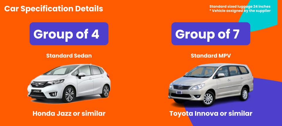 这取决于您的团体规模。4 人团体选择本田 Jazz 或类似车型,7 人团体选择丰田 Innova 或类似车型