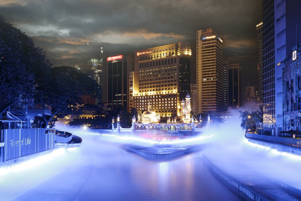 在夜间体验迷人的生命之河,这里的海滨因色彩缤纷的灯光和水景而变得生机勃勃。