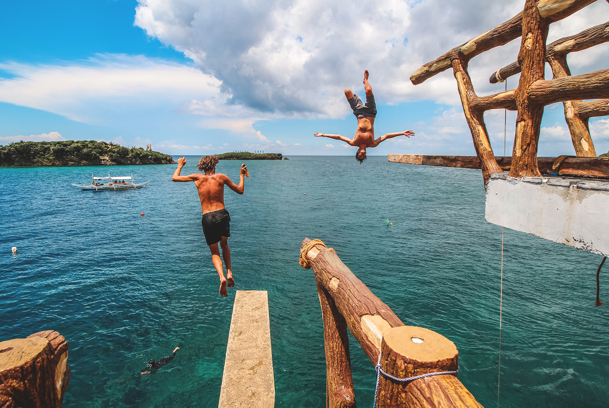 从不同高度的悬崖跳水,跳入长滩岛清澈的海水中