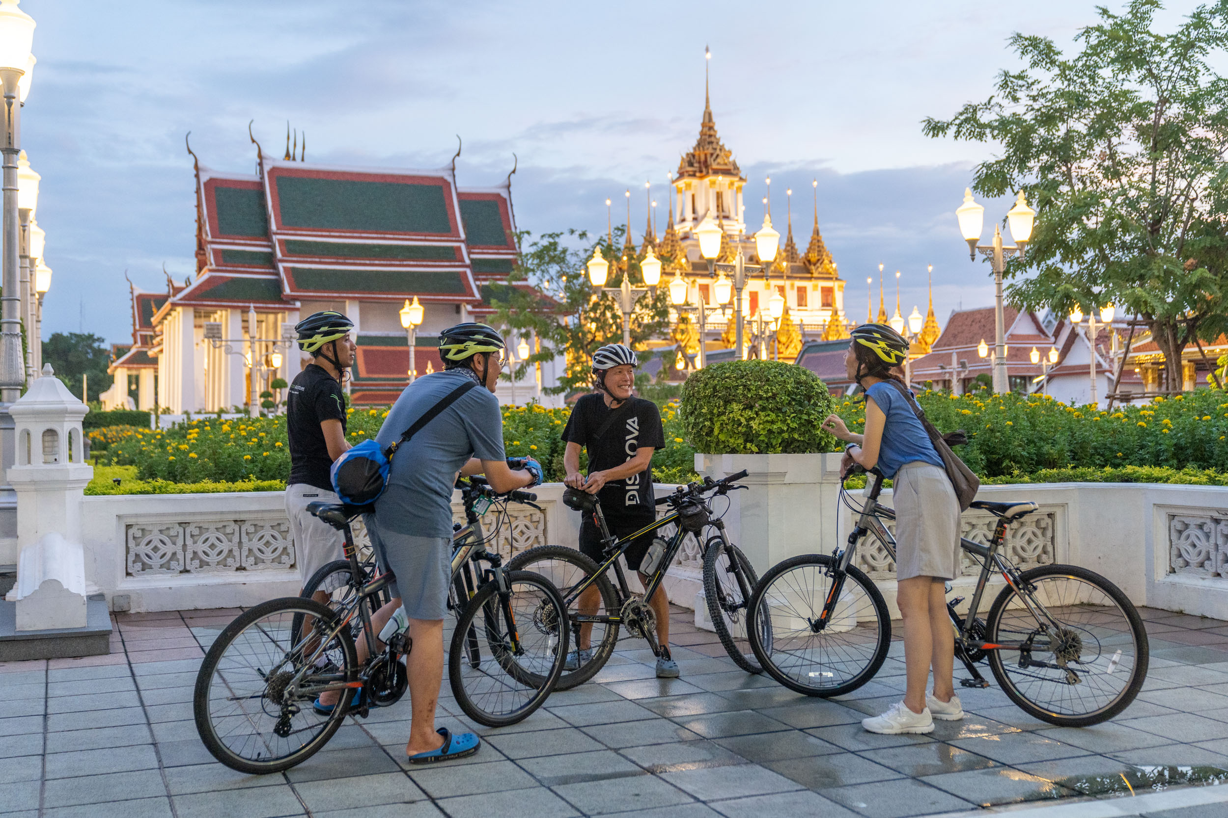 再次穿越湄南河后,您将探索夜间最繁忙的充满活力的花卉市场。然后您将骑车前往另一座灯火通明的寺庙-卧佛寺,并参观曼谷王国前四位国王的四座佛塔。最后,骑车经过大皇宫前往皇家田广场公园,在结束旅程之前参观其可爱的夜市。