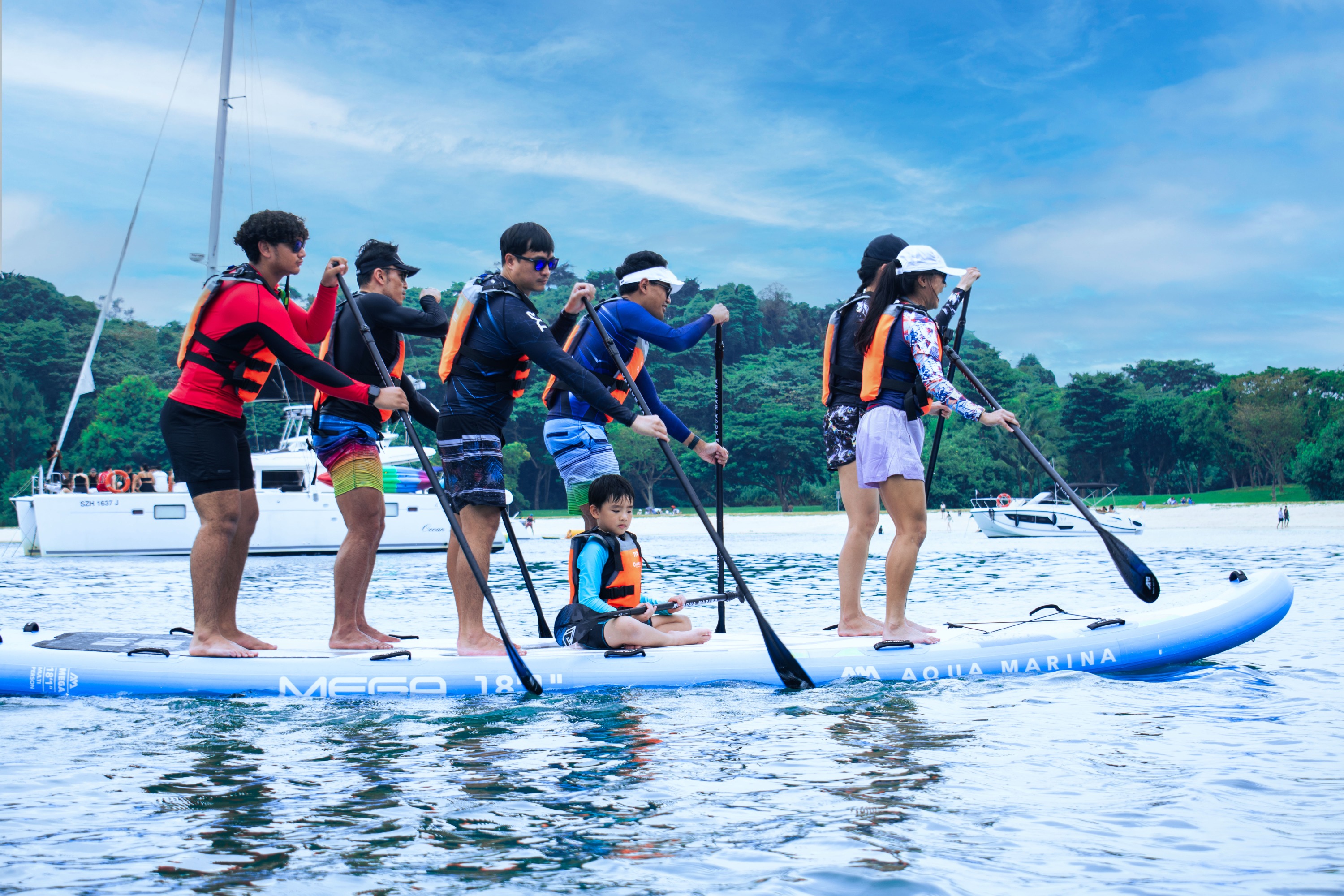 当您想和朋友们一起在站立式桨板上尽情玩乐时,这就是您所需要的。我们的 Mega SUP 可让您与最多 7 位朋友一起在一块巨型冲浪板上划桨,该冲浪板在任何水况下都坚固稳定