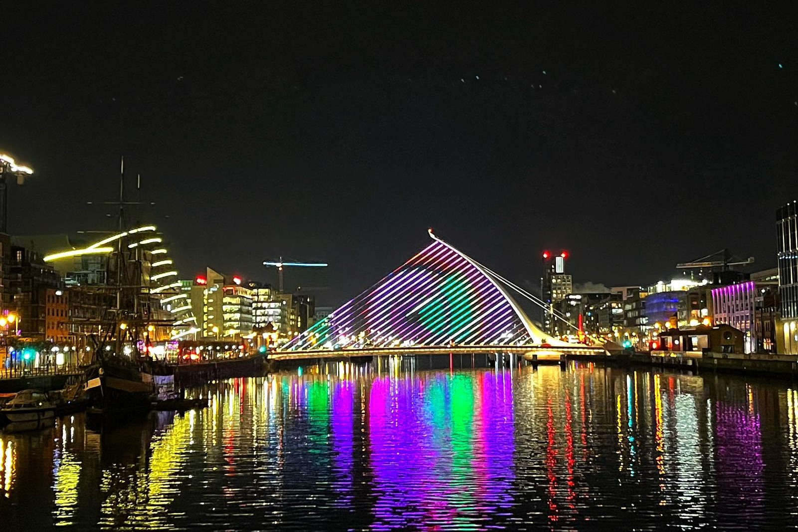 塞缪尔·贝克特大桥 (Samuel Beckett Bridge) 闪烁着节日灯光,增强了城市夜间的建筑美感