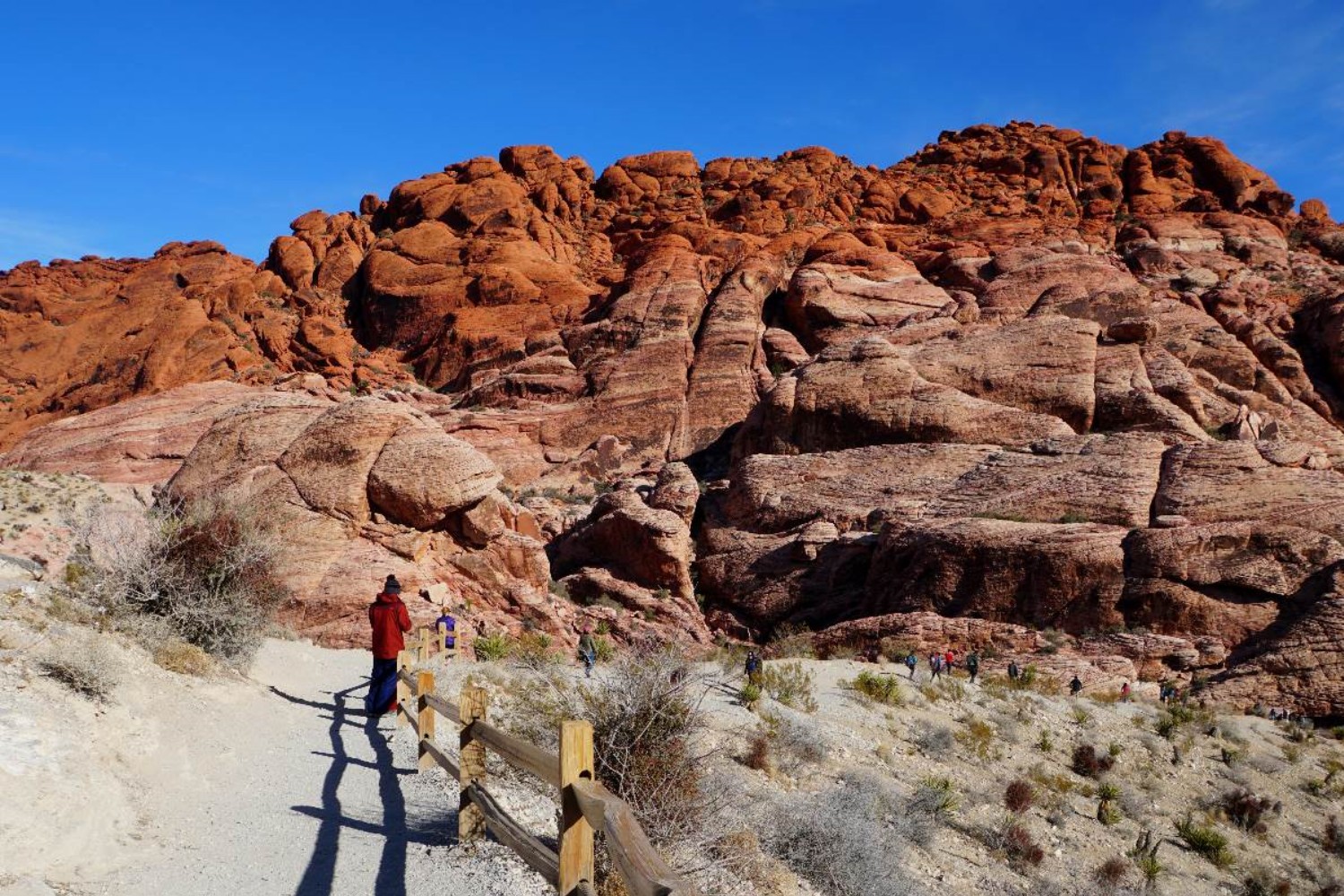 惊叹于周围的险峻悬崖和红色岩石尖顶