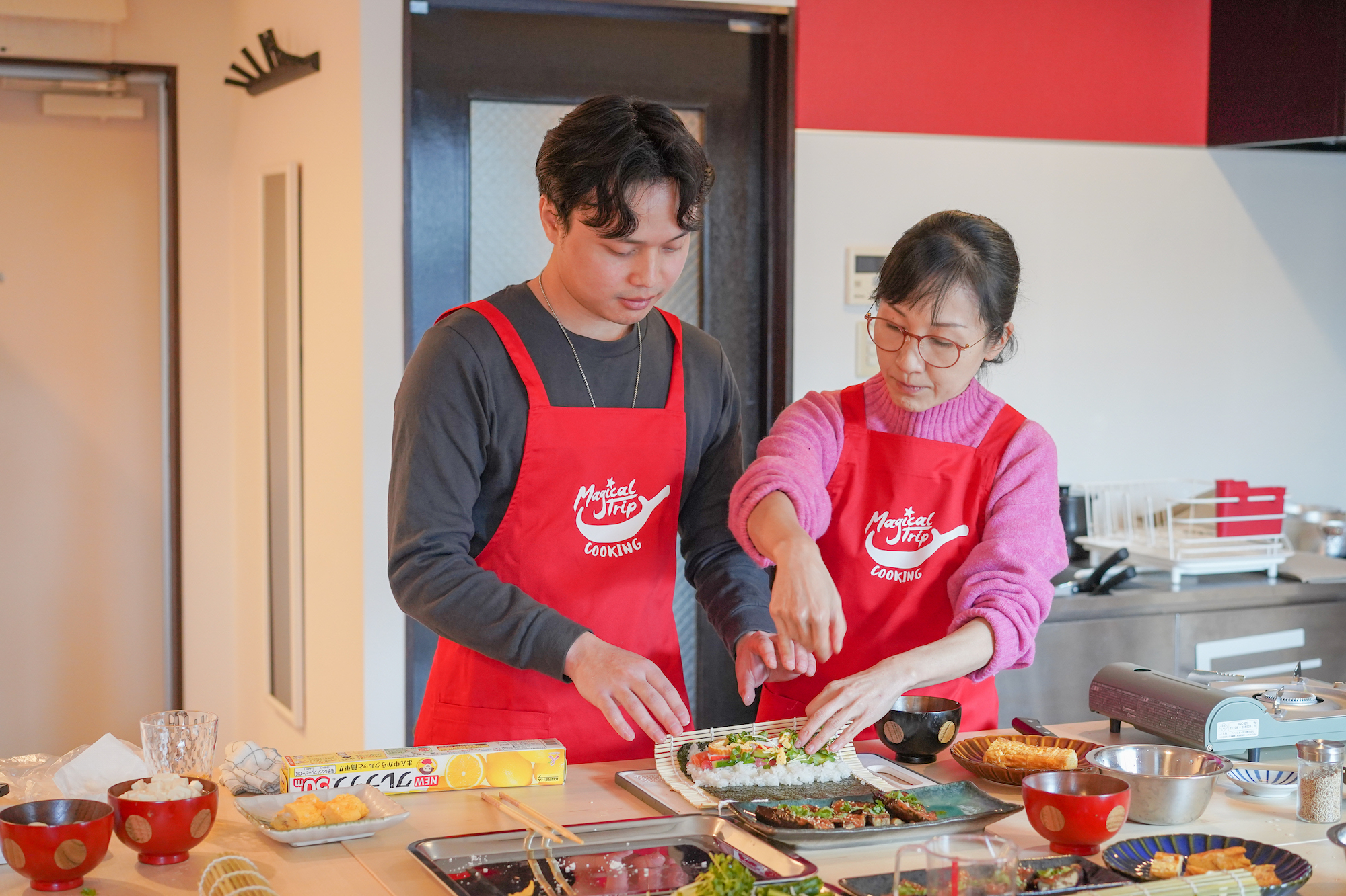 一旦我们收集了原料,我们将转移到厨房工作室开始我们的烹饪课程。在指导下,您将掌握日本家庭式烹饪的技巧,从精确地使用日本刀到准备基本元素,例如制作味噌汤的高汤和制作用醋调味的寿司饭。除了寿司之外,您还将深入研究制作正宗的菜肴,例如味噌汤、茄子田乐和美味的大岛卷玉子(鸡蛋卷)。