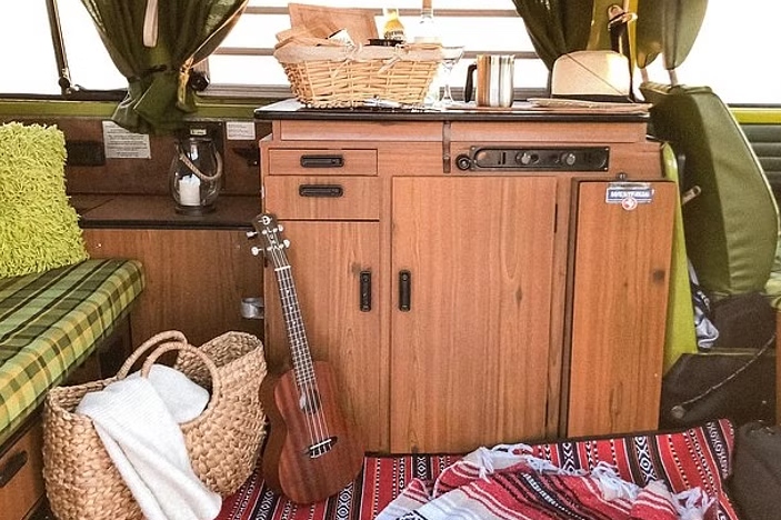 我们的老式大众货车舒适的内饰营造出完美的公路旅行氛围
