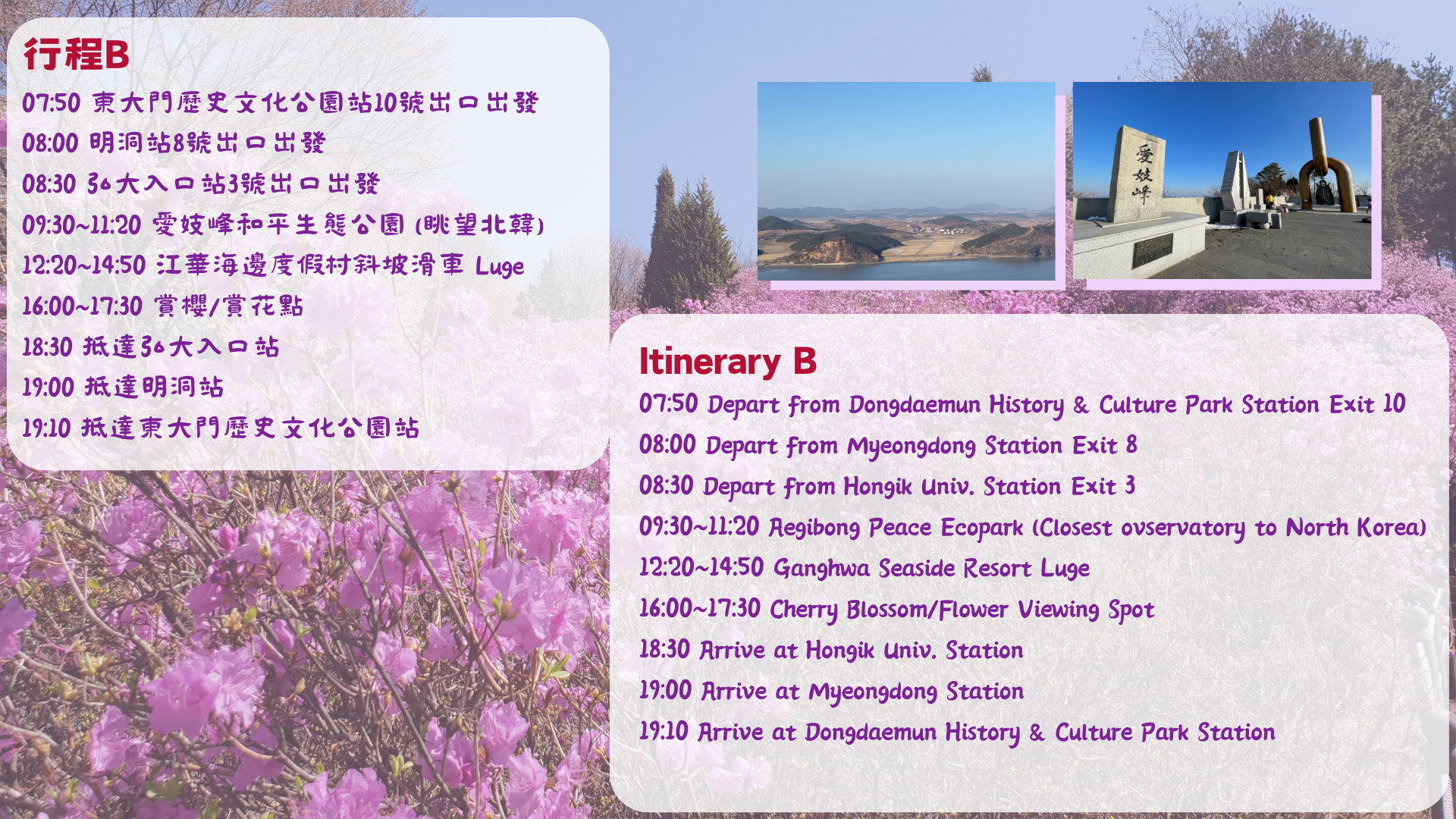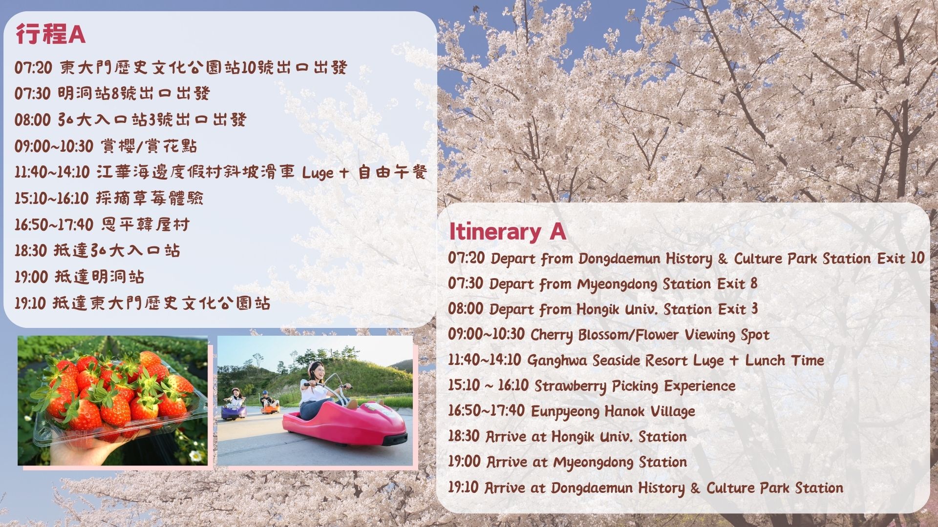 #樱花/赏花景点 ※ 赏樱花或赏花景点会根据花期而定,也可能视情况变更为其他赏花景点 3月底至4月中旬左右 富川远美山(杜鹃花、樱花) 4月左右 仁川大行程(都会花、郁金香、植物园、动物园) 除了赏花,两趟。