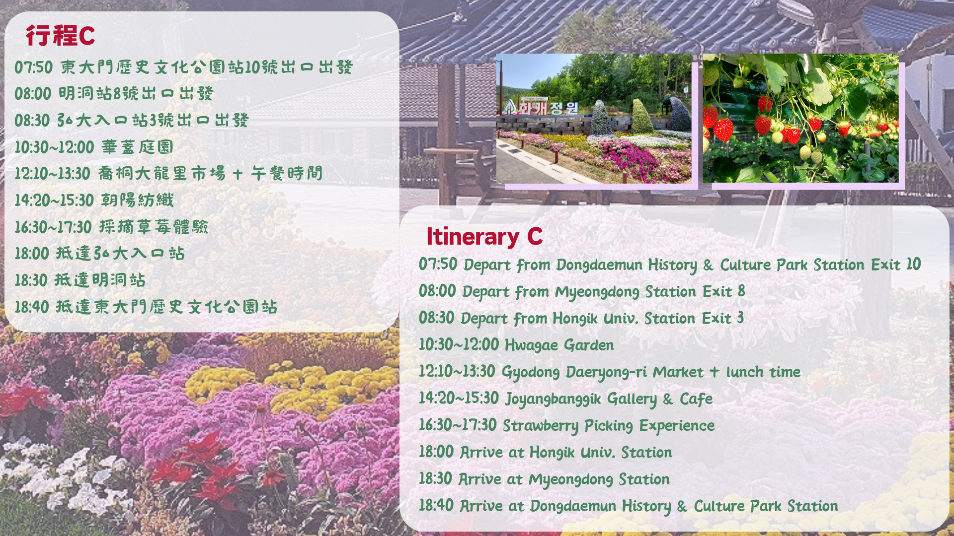 - 行程A 草莓采摘体验 + 江华海滨度假村滑车 + 恩平韩屋村 * 行程B 爱姬峰和平生态公园 + 江华海滨度假村滑车 * 行程C 花开花园 + 大龙里市场 + 咖啡厅 + 草莓采摘