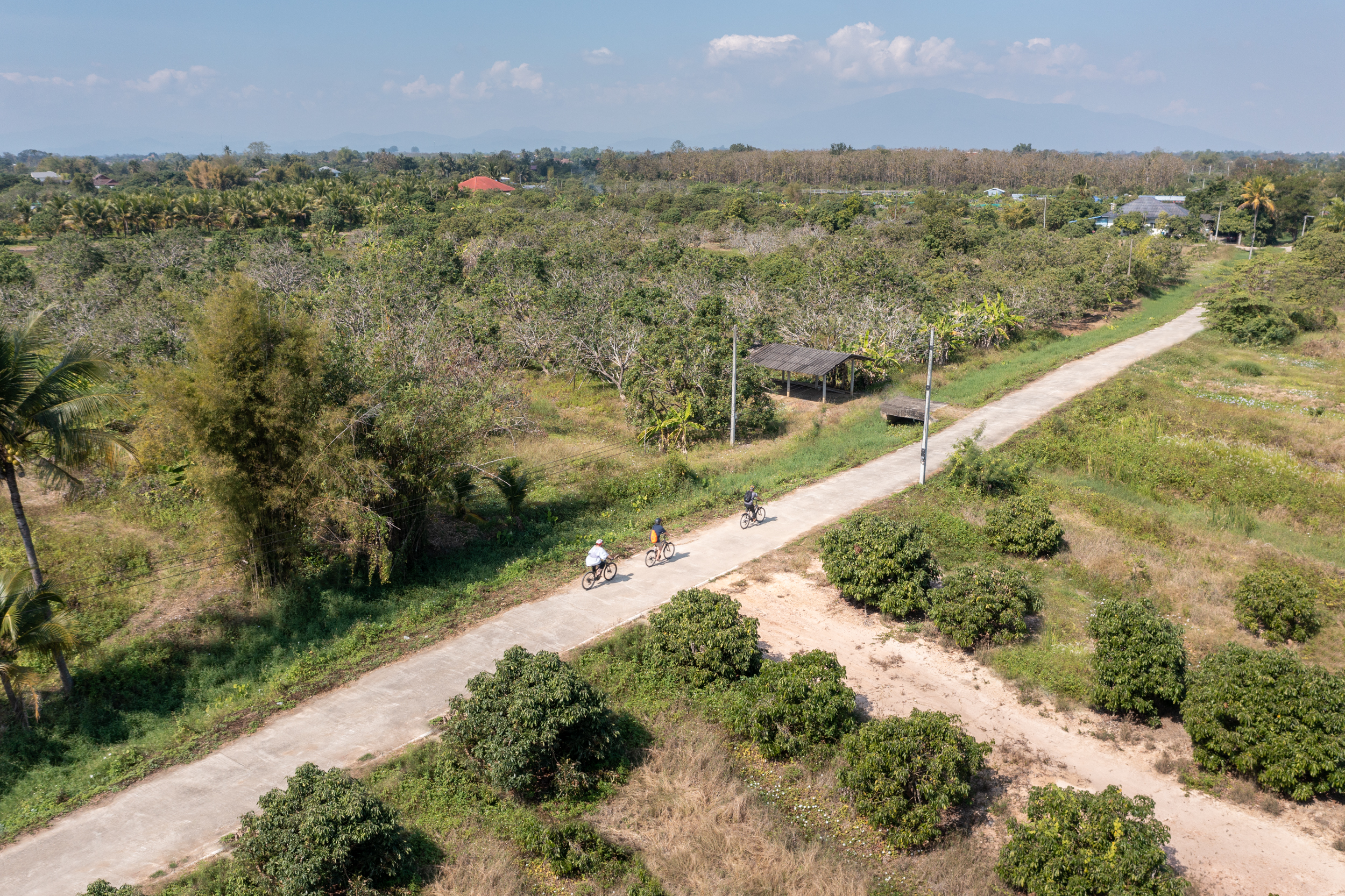 骑自行车穿越乡村:骑车出城,自行车之旅将穿过乡村前往清迈,漫步穿过果园和运河。