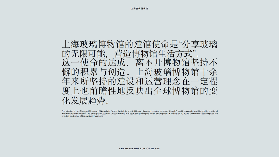 建立于2011年的上海玻璃博物馆主场馆收藏了来自古今中外、世界各地的玻璃艺术作品和设计作品,展览了玻璃与人类历史、科技、艺术和设计之间的关系。随着博物馆发展,常设展览面积不断增长,所持有藏品目前已超过4000余件。2022年推出的NXT项目,以现有藏品和场馆为基础,突破线性叙事,扩展作品叙事语境,为观众提供全新而灵活的参观体验。该项目以创造性的虚拟空间扩展了博物馆的未来可能