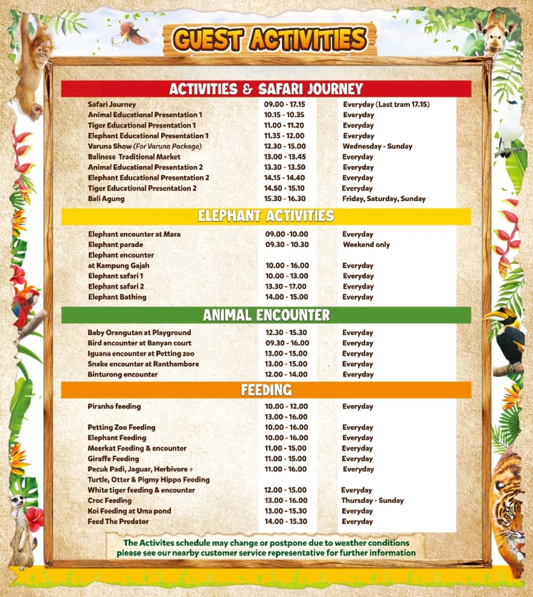参观期间,您可以通过各种动物互动体验近距离接触动物。 宠物动物园是亲身体验的理想场所,您可以与温顺的动物互动,并了解更多关于它们栖息地的知识。 在这里,您可以欣赏雄伟壮观的苏门答腊象等大象,并有机会目睹苏门答腊虎的矫健身姿。您可以选择步行游览或选择不同的旅游套餐,探索公园的不同区域,沉浸在热带雨林步道的迷人景色和声音中。