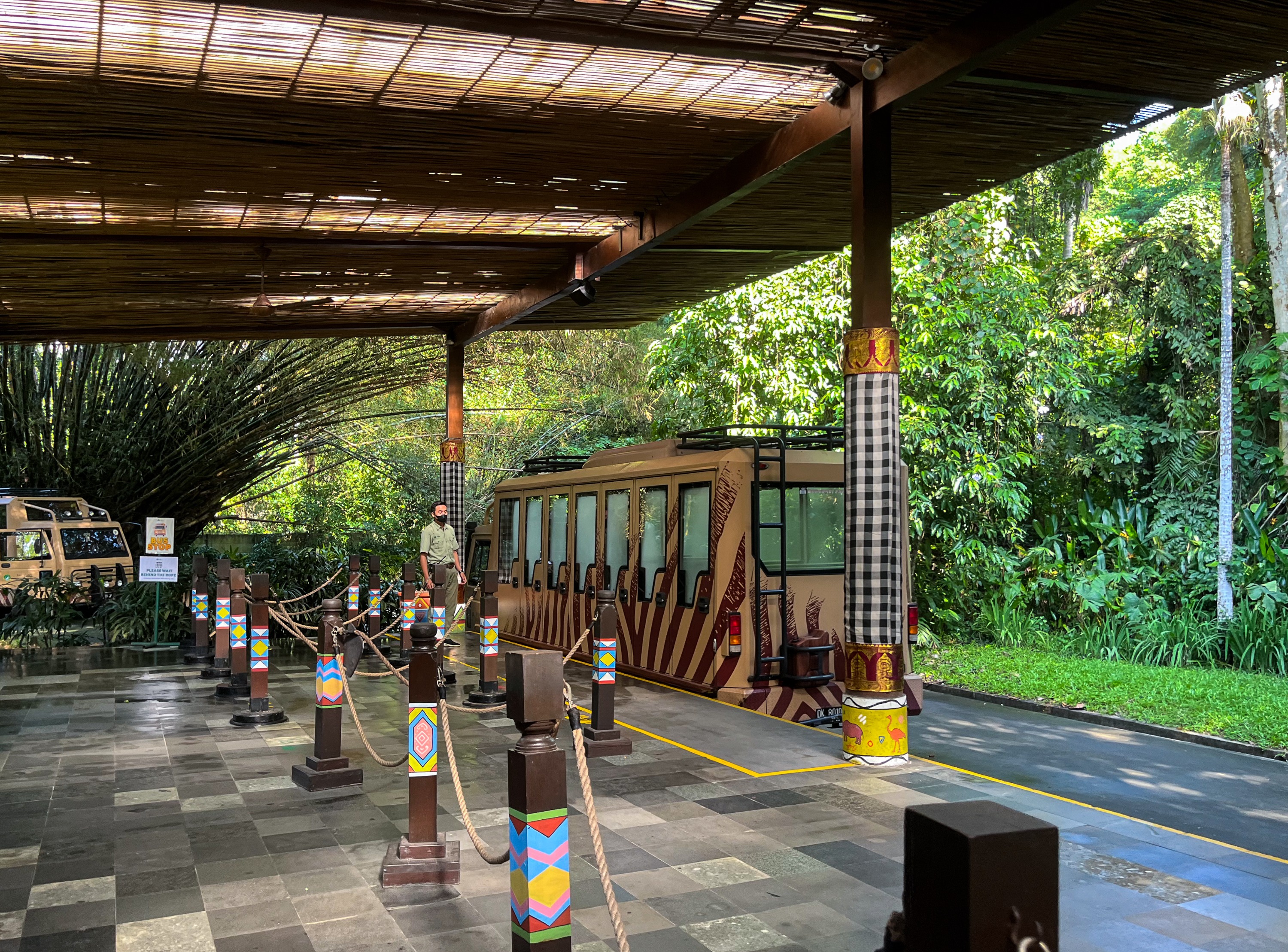 乘坐巴厘岛野生动物园 (Bali Safari Park) 的班车,轻松游览园区