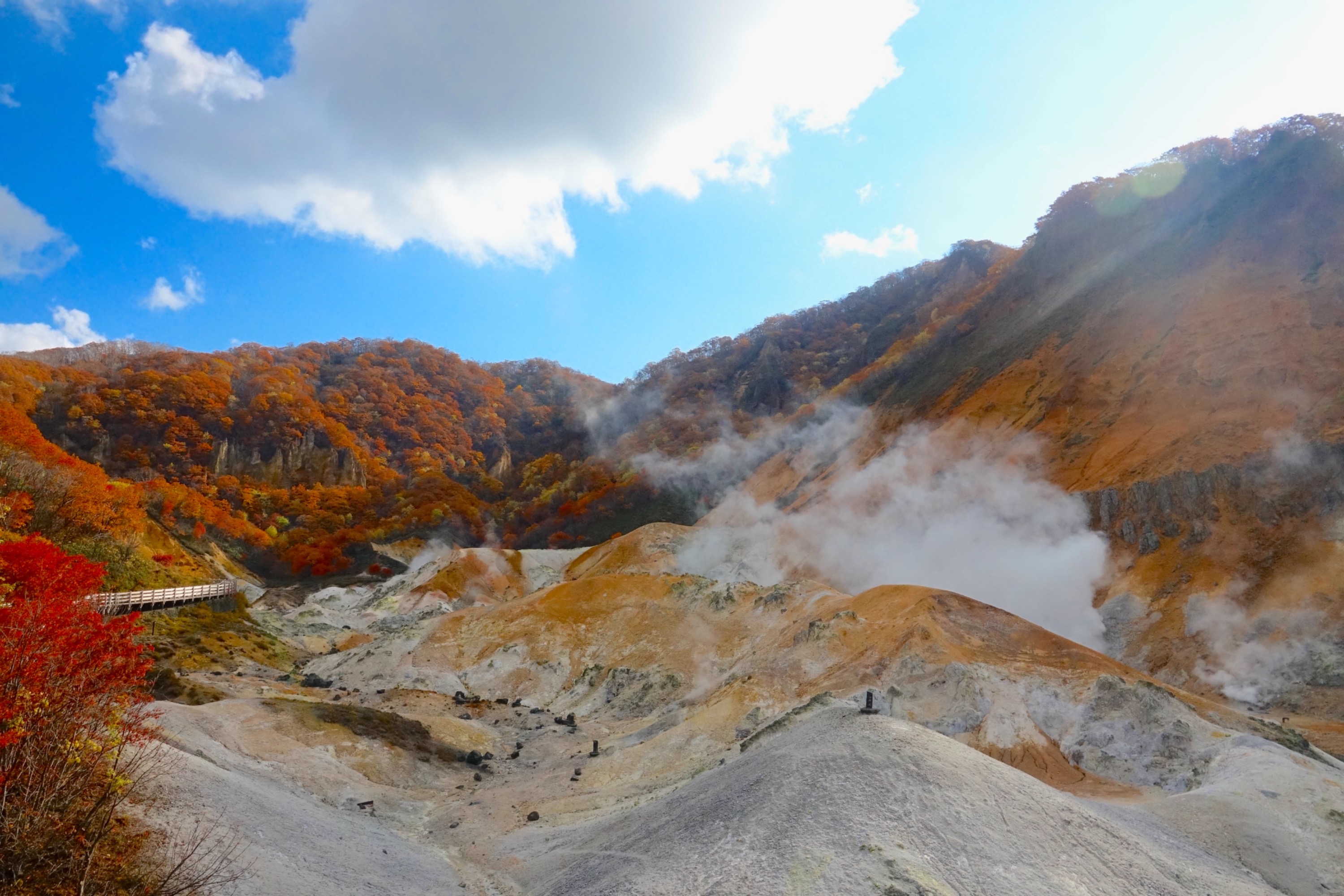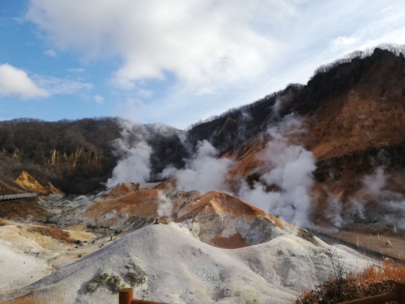 沿地狱谷步道入口游览奇特的火山口景观,遍布会不断喷出蒸气的小洞穴,这里亦是登别温泉的泉源之一