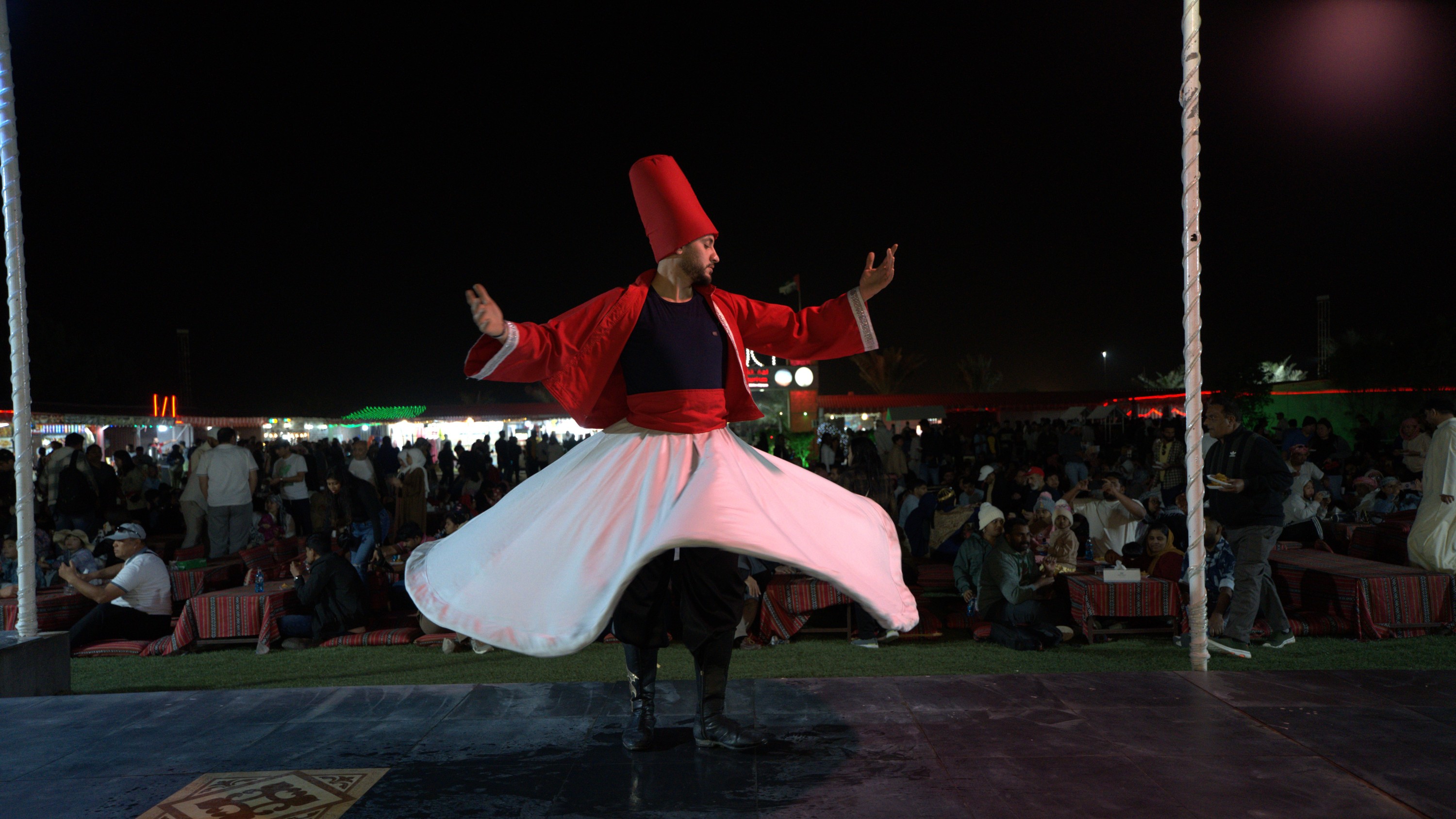 欣赏沙漠天空下传统 Tanoura 舞蹈的优雅旋转