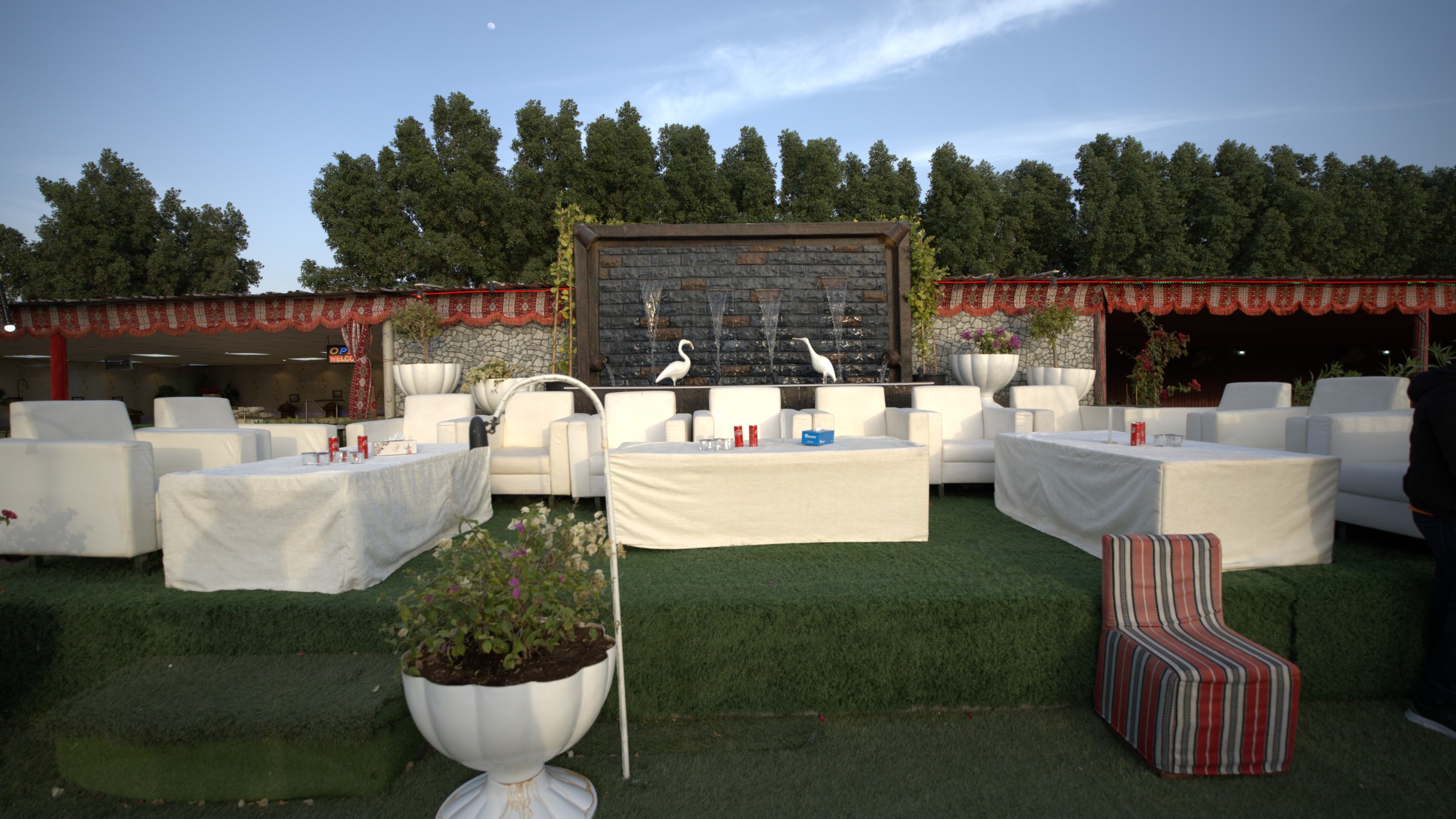在沙漠营地享受舒适的座椅和宁静的喷泉景观,尽情放松