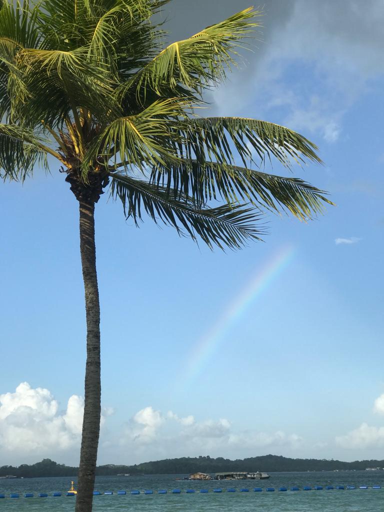 彩虹和椰子树在我们的白沙海滩随处可见