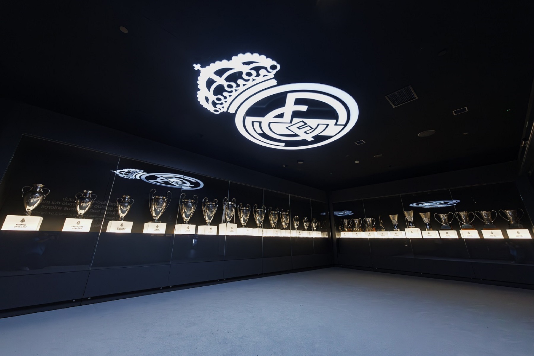 惊叹于皇家马德里足球俱乐部的奖杯展示,展示他们的辉煌成就