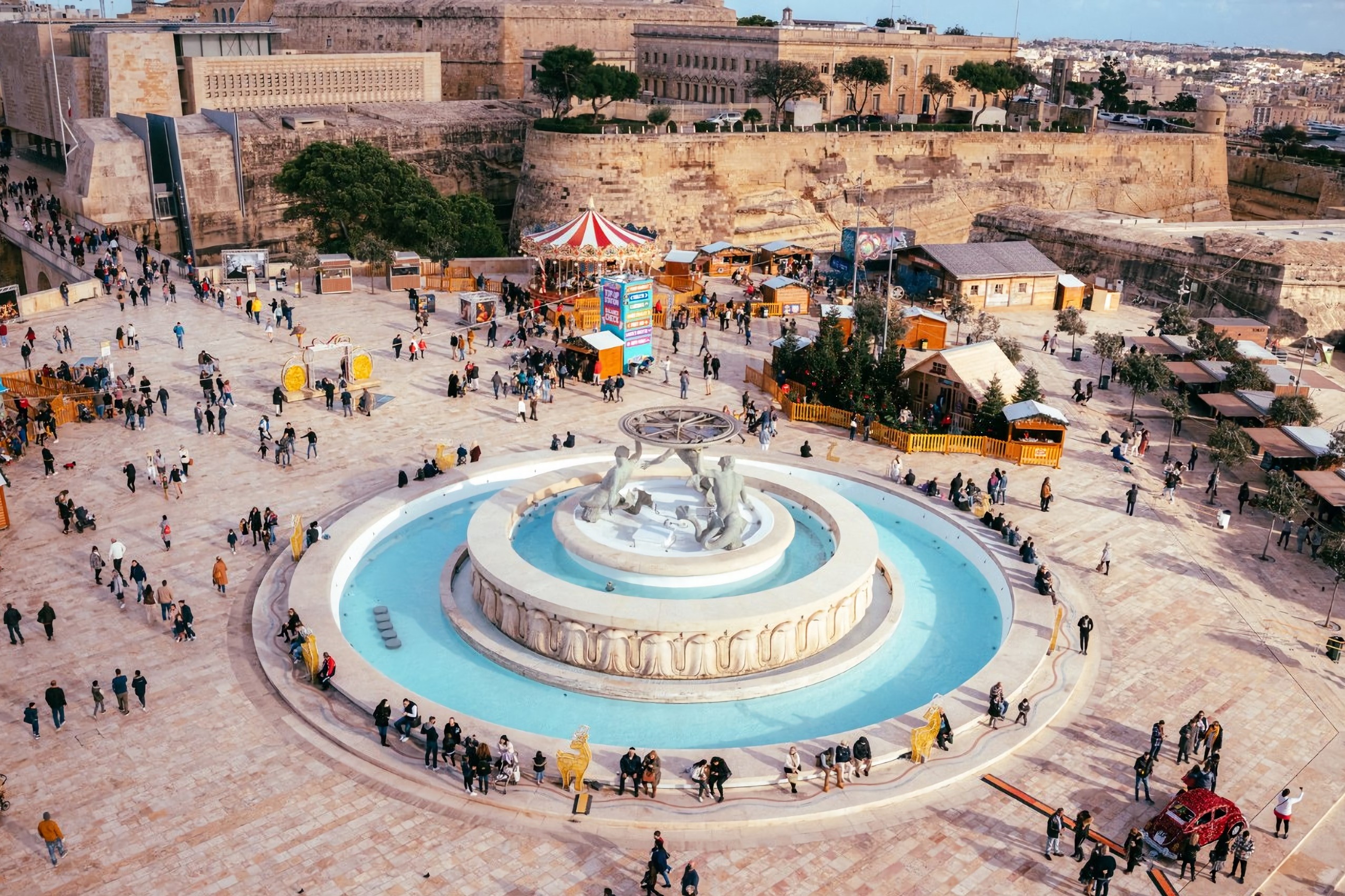 惊叹于标志性的特里顿喷泉,它是瓦莱塔通往城市的门户的象征