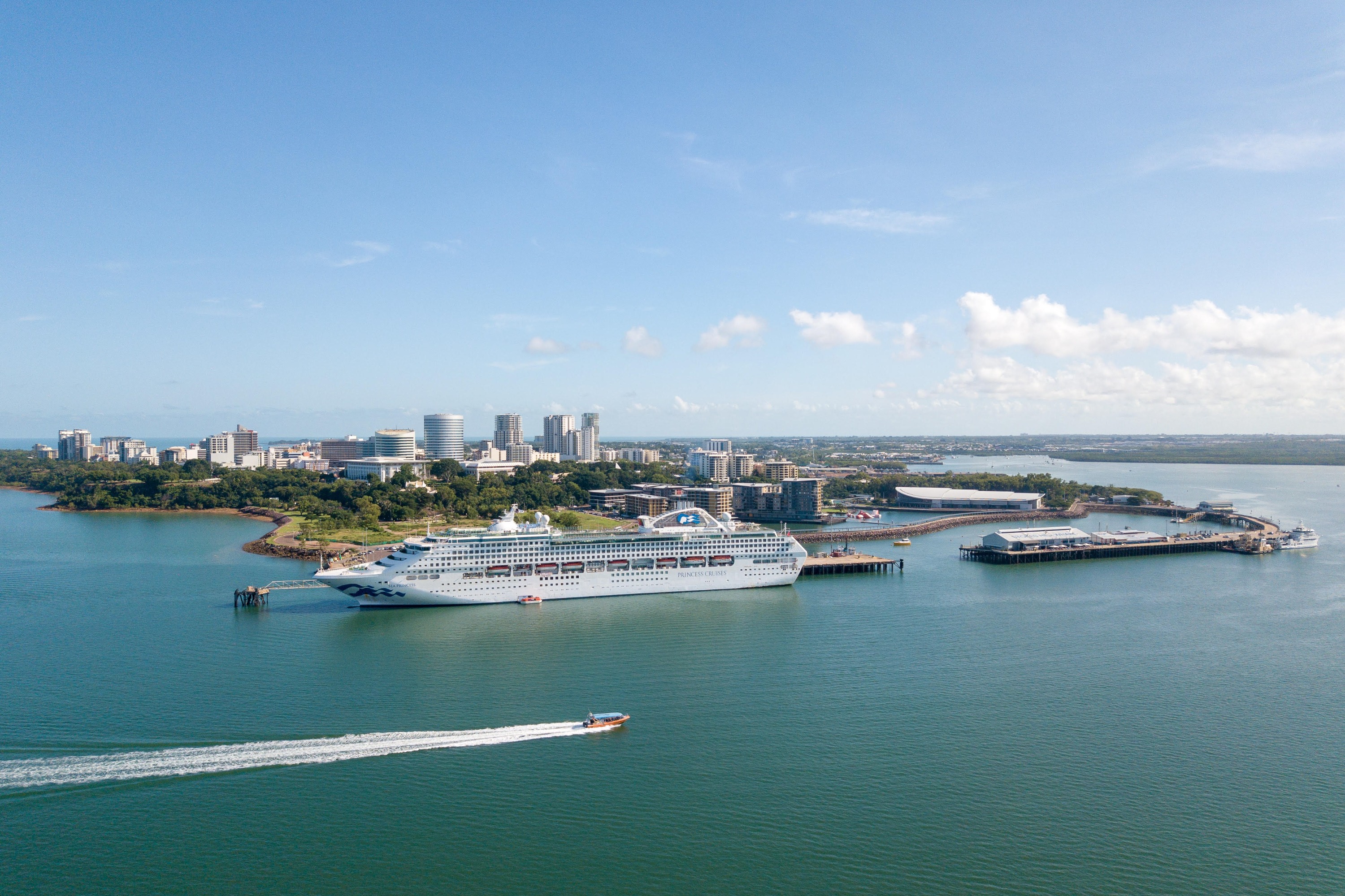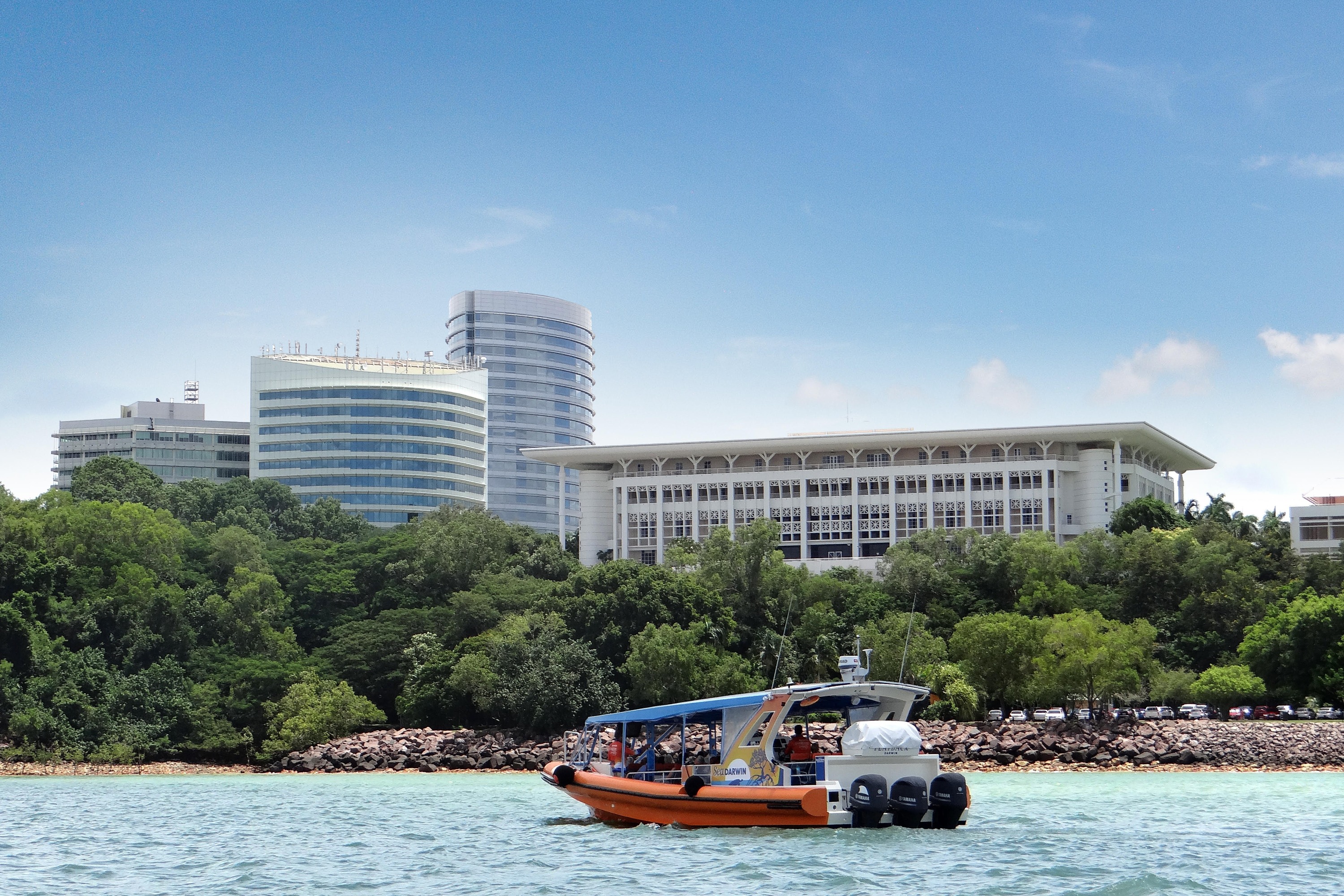 在舒适的船上欣赏达尔文天际线和海滨的独特视角