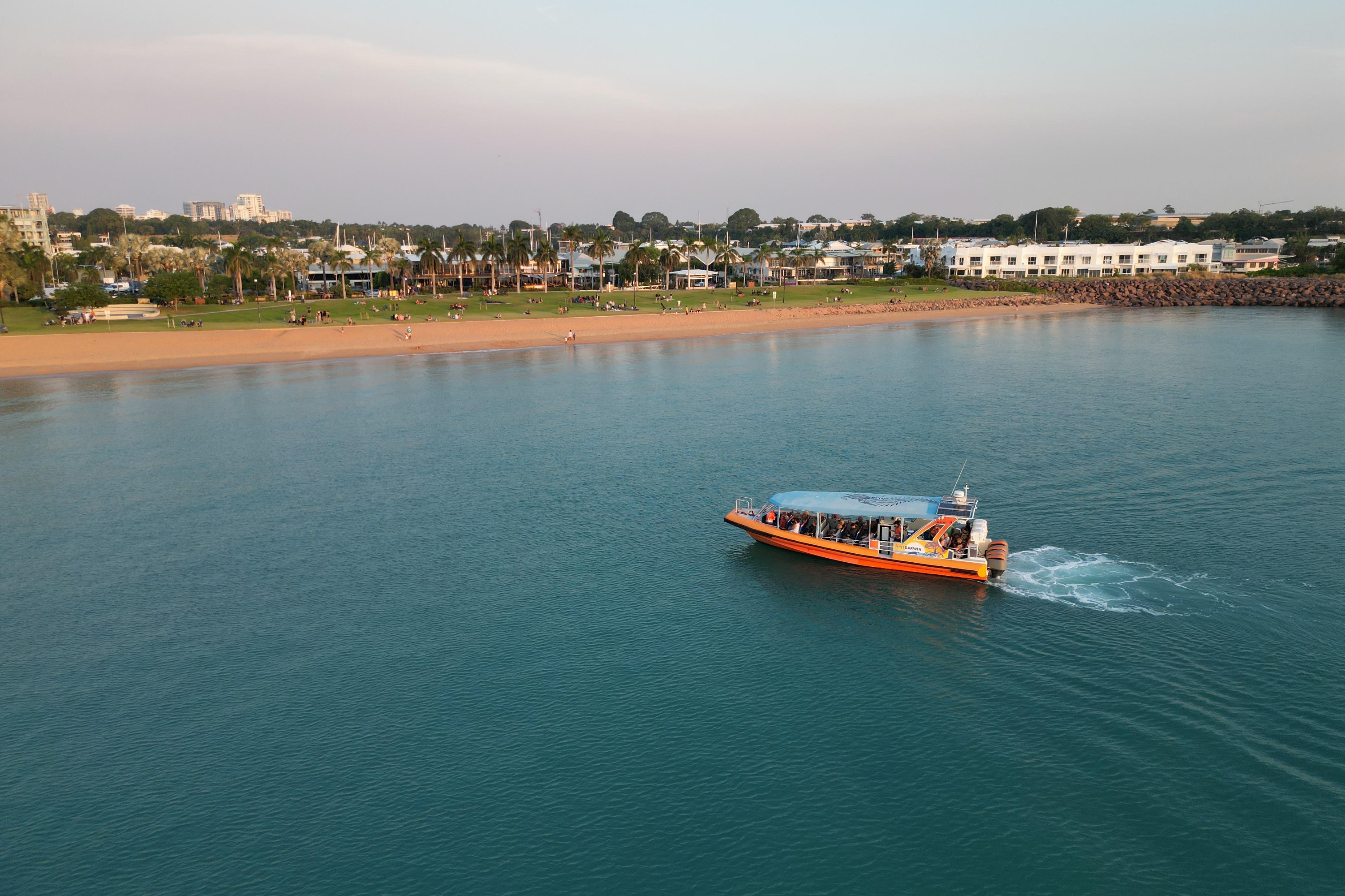 乘坐快艇从斯托克斯山码头出发,踏上惊心动魄的旅程,带您穿越达尔文的城市景观。抵达卡伦湾海滩,在温暖的微风和令人惊叹的热带日落中品尝美味的炸鱼薯条和一杯起泡酒。