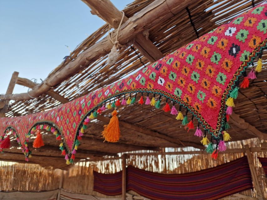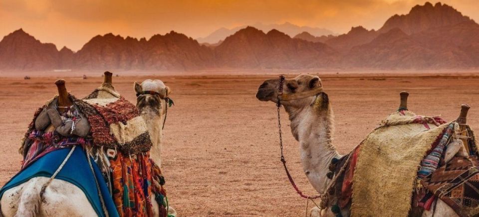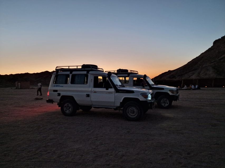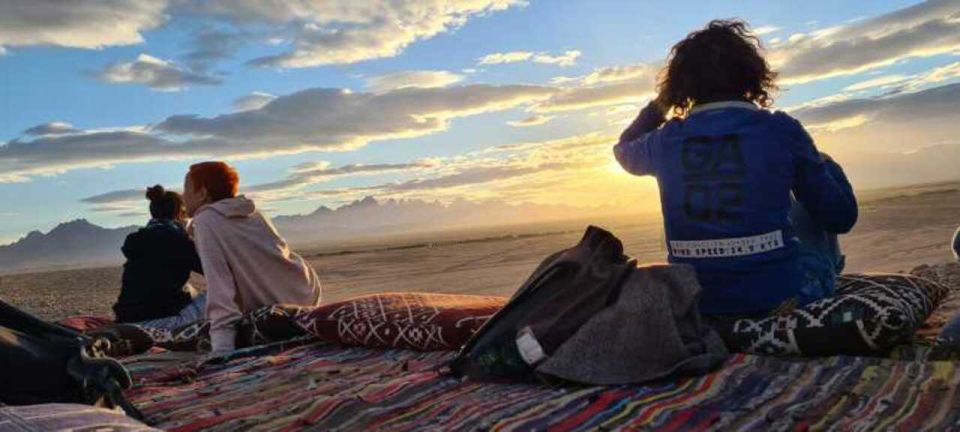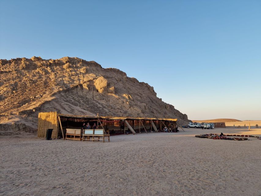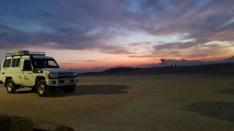 从您的饭店乘坐吉普车开始您的冒险之旅。骑 26 公里进入红海风景如画的沙漠。开车穿过日落观察区,直到到达贝都因人营地,在那里您将享用清凉饮料和贝都因草本茶。