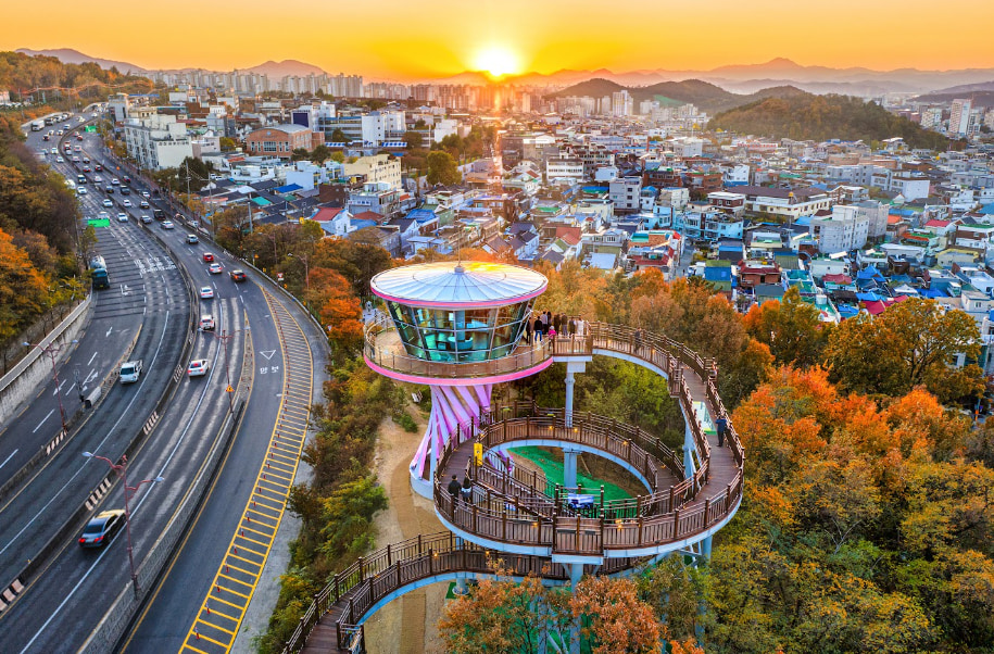 前山展望台的设计体现了前山洗衣公园的历史和标志,体现了编织衣物的形象。参观日落时间时,美丽的夕阳和大邱市中心的夜景一览无余