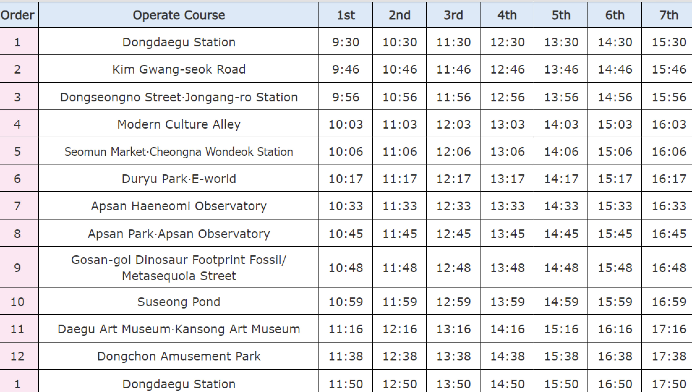 从大邱的交通圣地东大邱站出发,沿途有各种设施,金光石路,东城路,现代文化巷,Eworld,前山瞭望台,寿城池。因为是随上随下型巴士,所以您可以在任何地方下车,再次免费上车,前往其他旅游目的地!强烈推荐给那些以前从未去过大邱或害怕乘坐公共交通工具的人。
