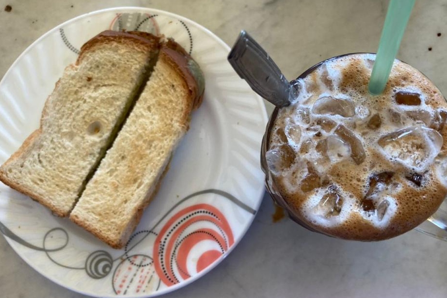 品尝完美的咖椰黄油吐司搭配茶饼,咖啡和茶的完美融合