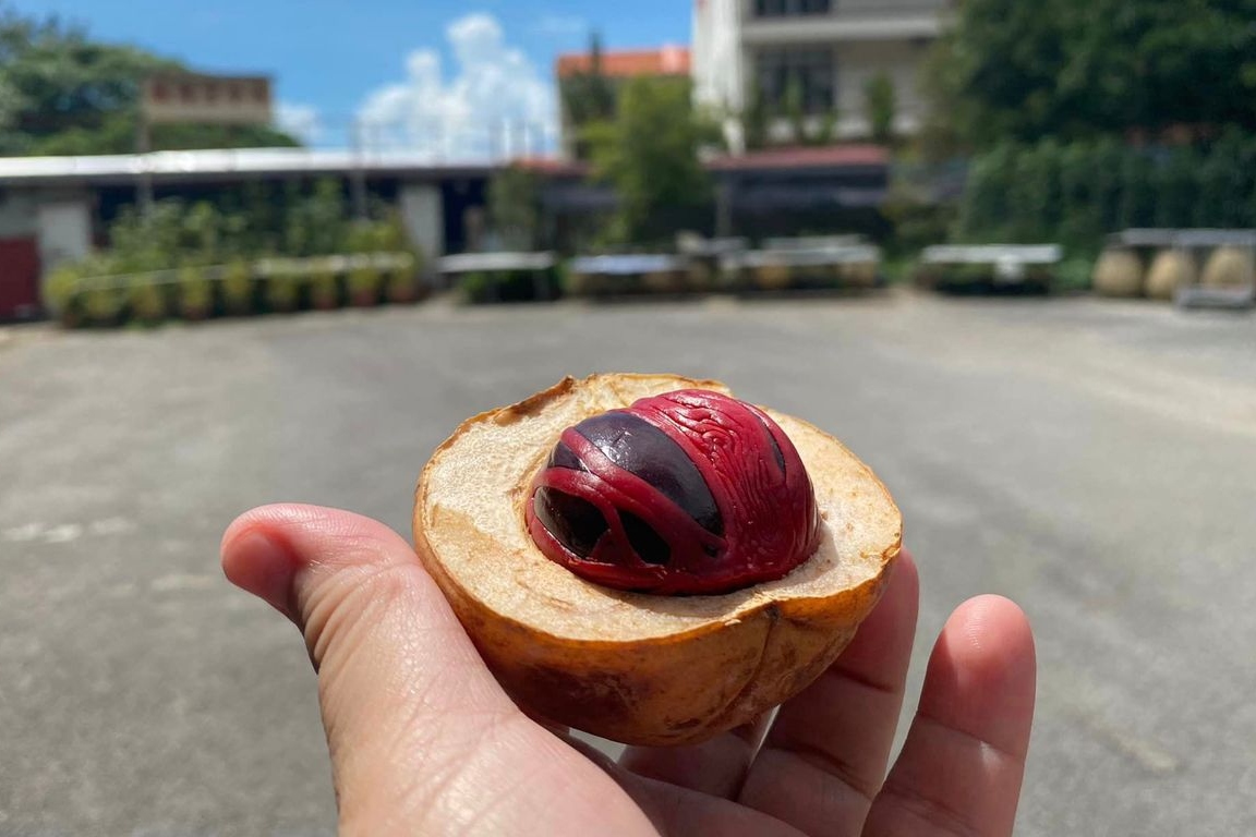 近距离观察成熟肉豆蔻的外表,它充满活力,皱巴巴的,散发着浓郁的芳香