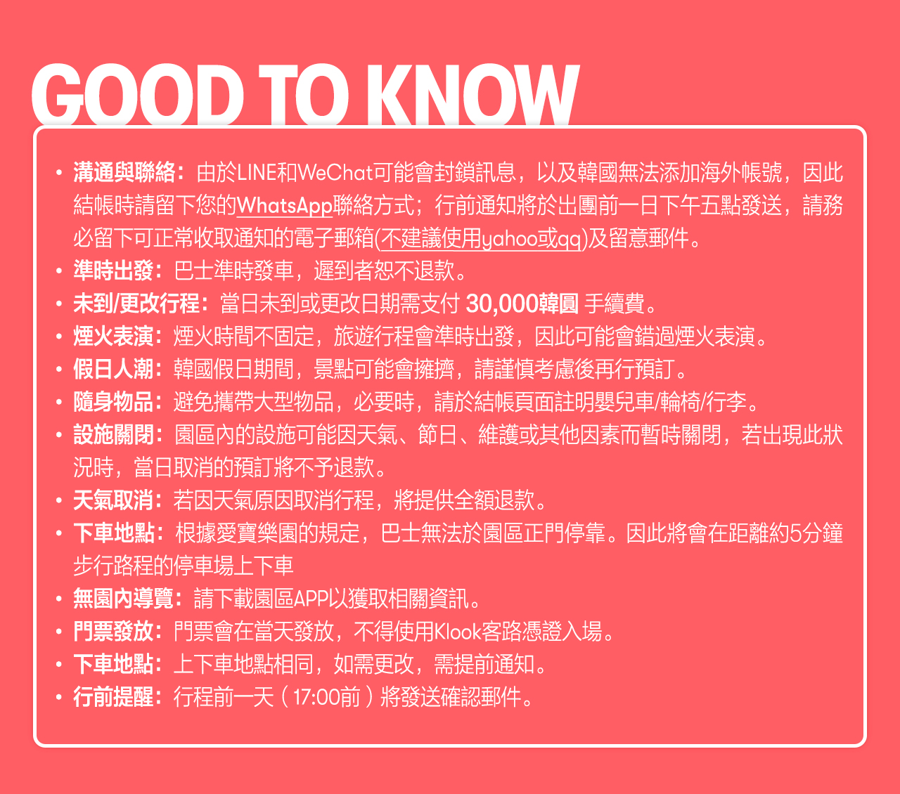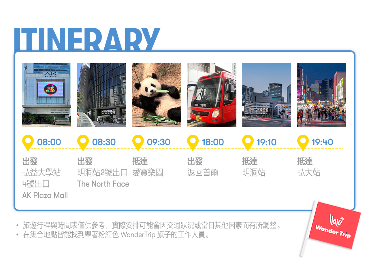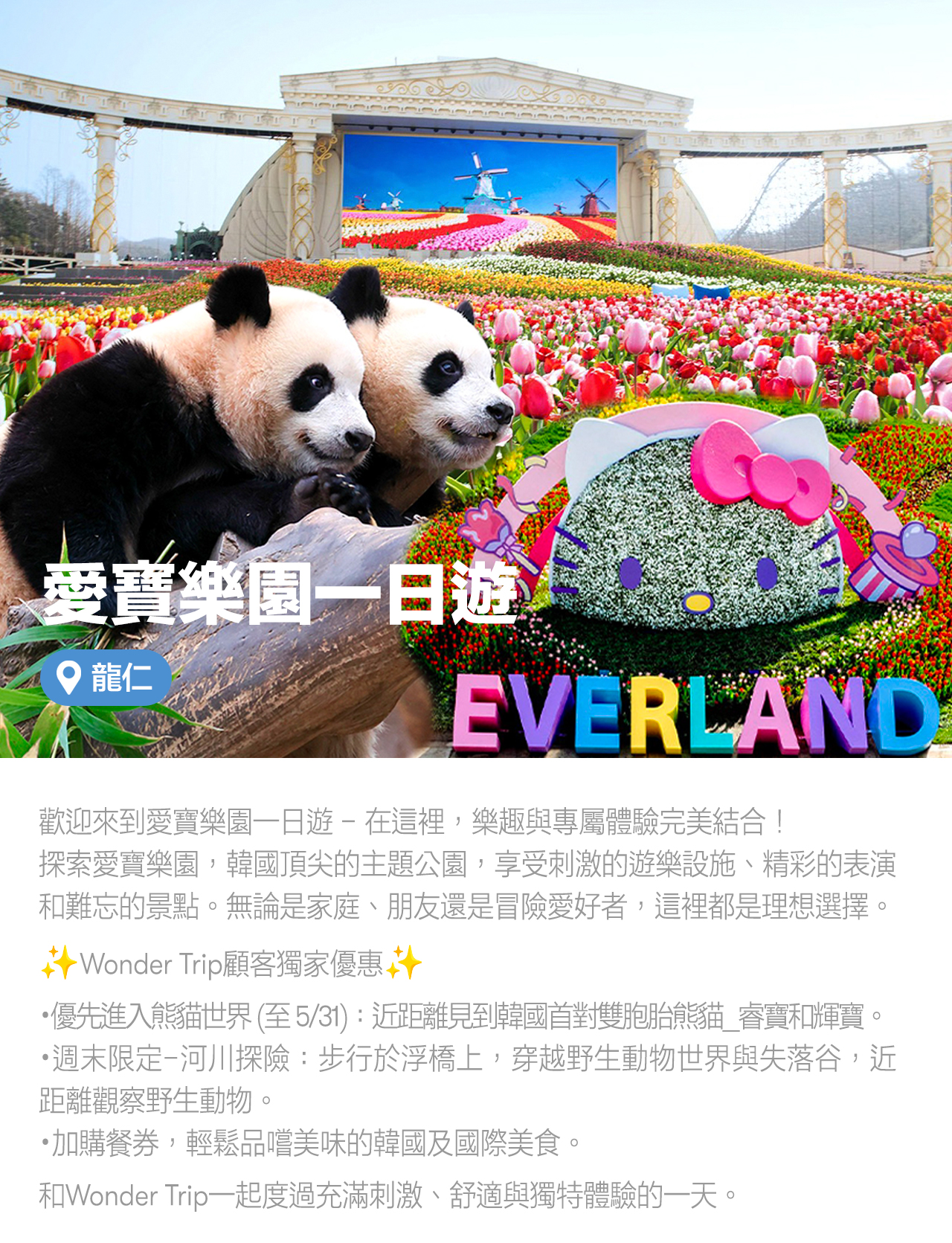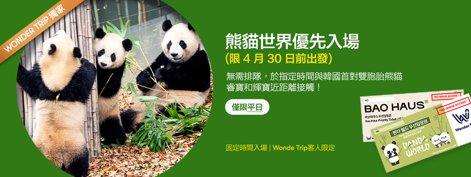 本行程提供独家优先入场权,让你无需排队即可进入熊猫世界,近距离观赏韩国首对自然繁殖的大熊猫双胞胎「瑞宝」和「惠宝」。此外,你还可以免排队进入宝豪斯第二季,了解熊猫妈妈艾宝的故事,让你的参观体验更加顺畅和难忘。
