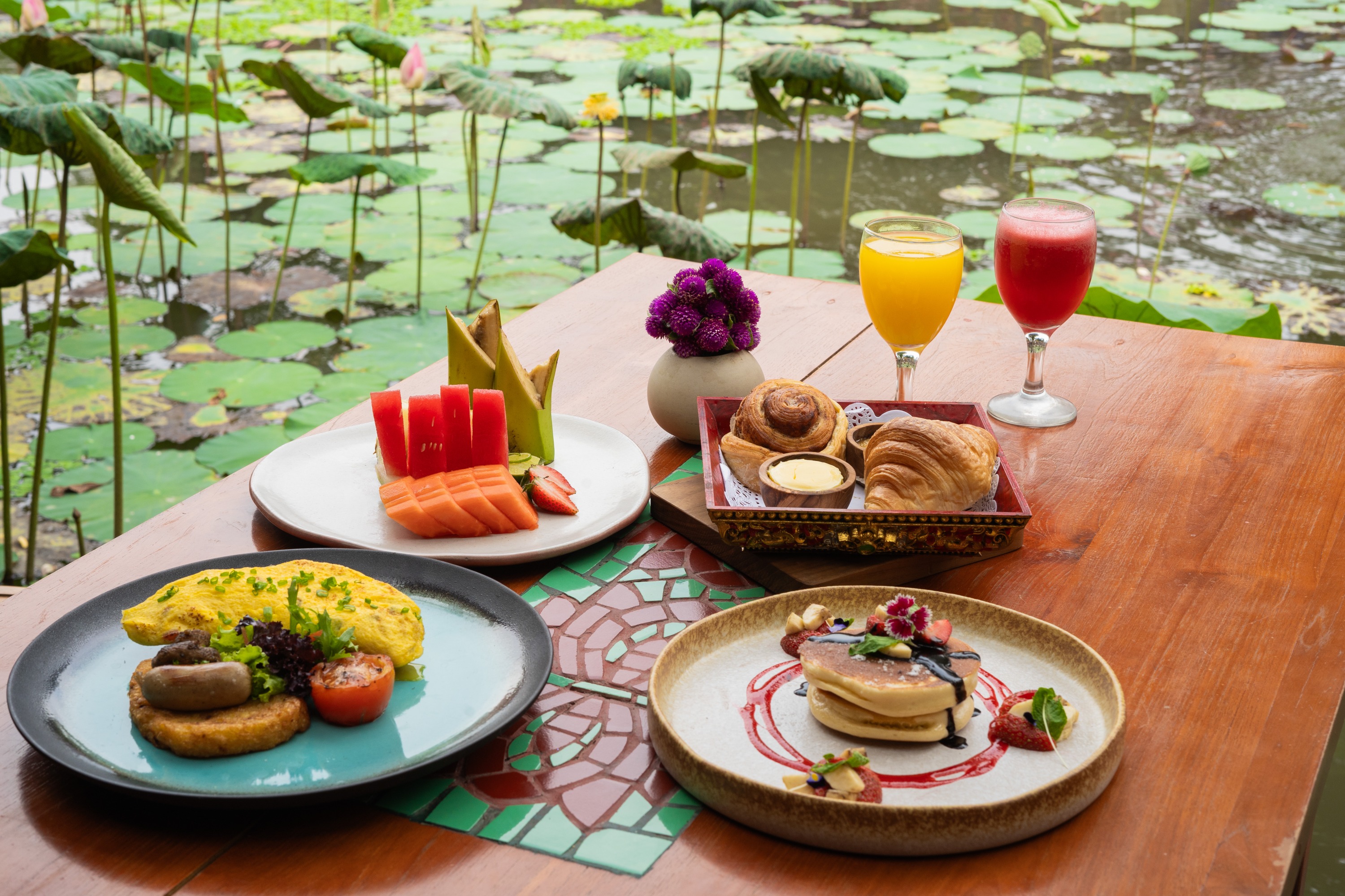 在寺庙旁的 The Cafe Lotus Ubud 享用精选菜单上的美味早餐