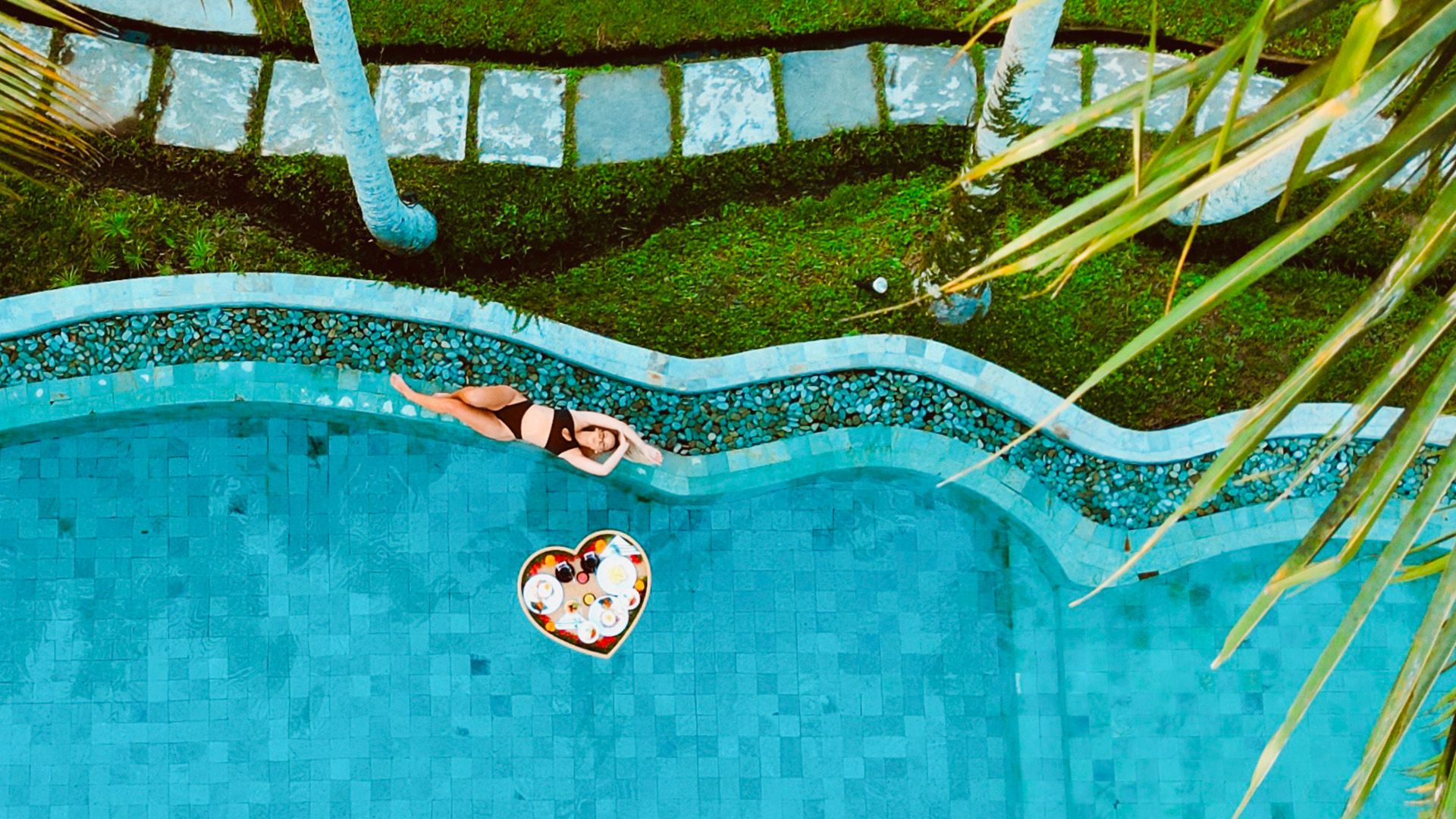 在泳池边放松,享用漂浮早餐